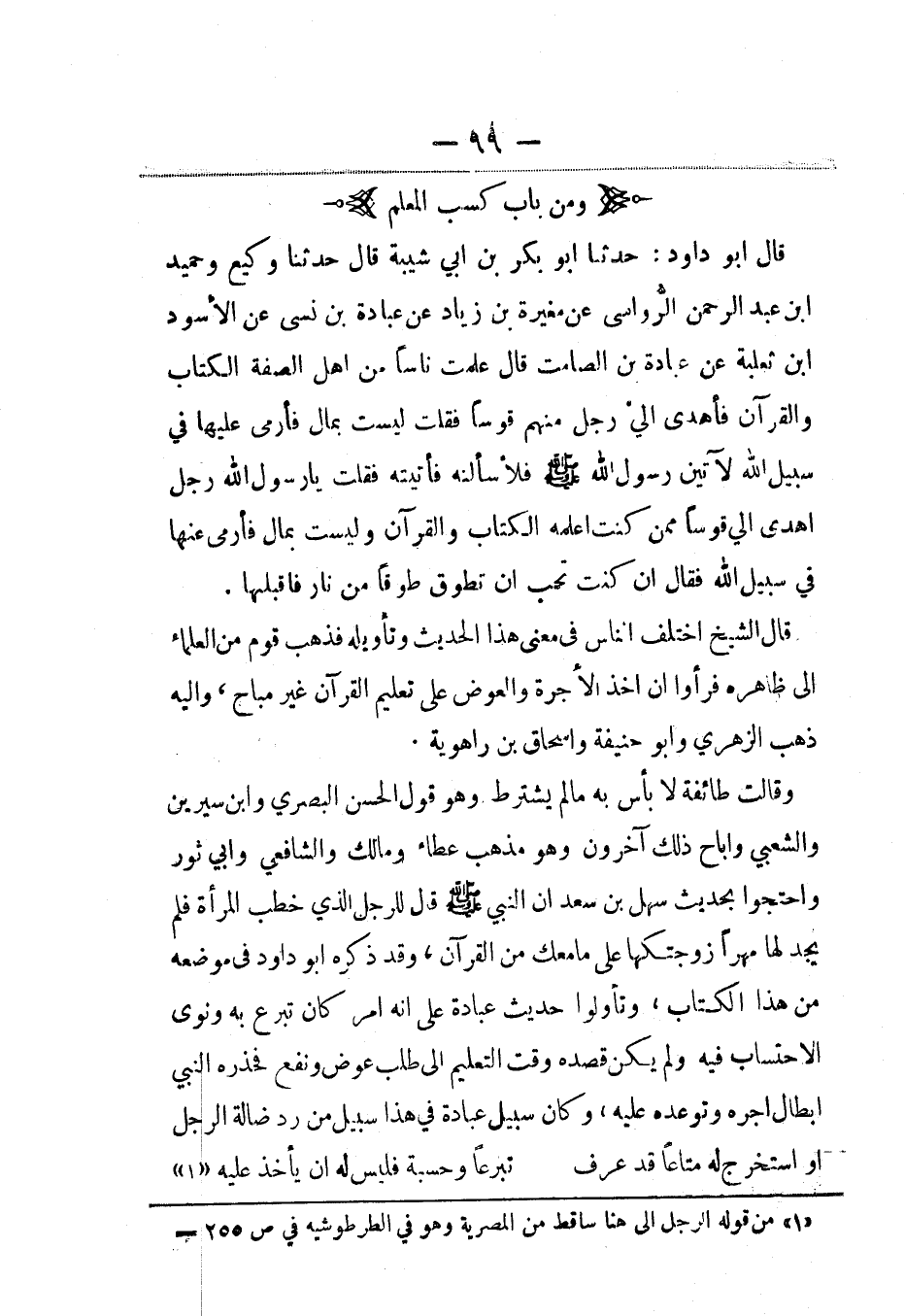 قال أبو داود: حدثنا أبو بكر بن أبي شيبة، قال: حَدَّثنا وكيع وحميد بن عبد الرحمن الرُّواسي عن مغيرة بن زياد عن عبادة بن نسى عن الأسود بن ثعلبة عن عبادة بن الصامت قال علمت ناساً من أهل الصفة الكتاب والقرآن فأهدى إلي رجل منهم قوسا فقلت ليست بمال فأرمي عليها في سبيل الله لآتين رسول الله صلى الله عليه وسلم فلأسألنه فأتيته فقلت يا رسول الله رجل أهدى إلي قوساً ممن كنت أعلمه الكتاب والقرآن وليست بمال فأرمي عنها في سبيل الله فقال إن كنت تحب أن تطوق طوقاً من نار فاقبلها.