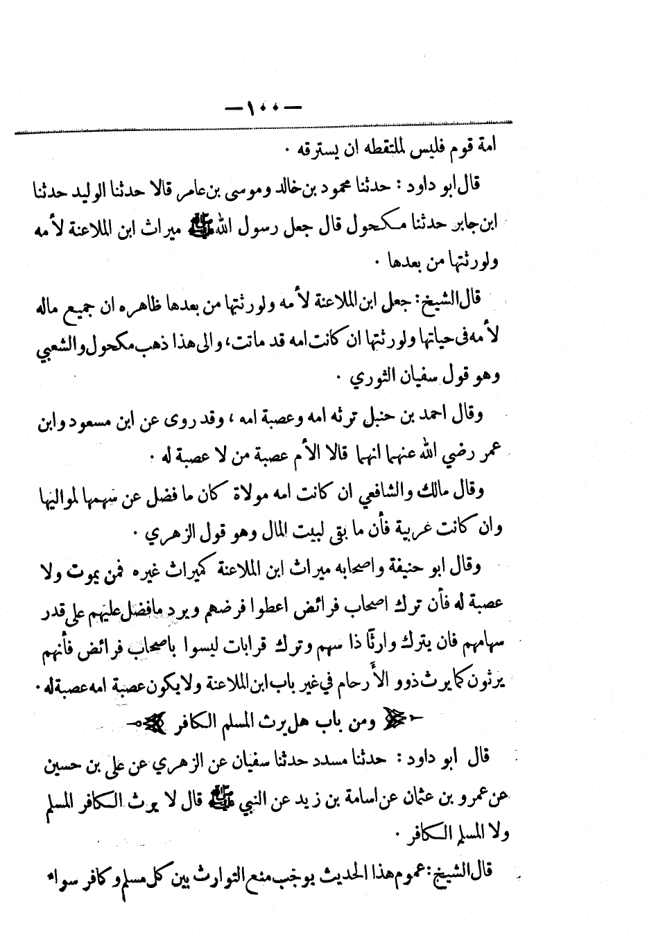 قال أبو داود: حدثنا مسدد حدثنا سفيان عن الزهري عن علي بن حسين عن عمرو بن عثمان عن أسامة بن زيد عن النبي صلى الله عليه وسلم قال لا يرث الكافر المسلم ولا المسلم الكافر.