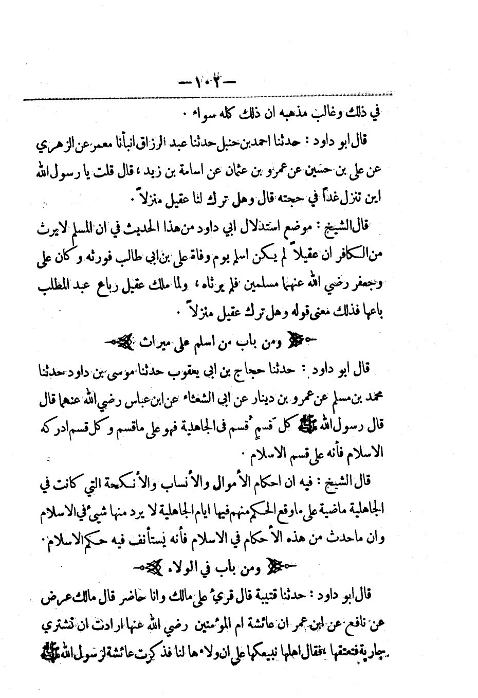 قال الشيخ: موضع استدلال أبي داود من هذا الحديث في أن المسلم لا يرث من الكافر أن عقيلاً لم يكن أسلم يوم وفاة علي بن أبي طالب فورثه وكان علي وجعفر رضي الله عنهما مسلمين فلم يرثاه، ولما ملك عقيل رباع عبد المطلب باعها فذلك معنى قوله وهل ترك عقيل منزلاً.