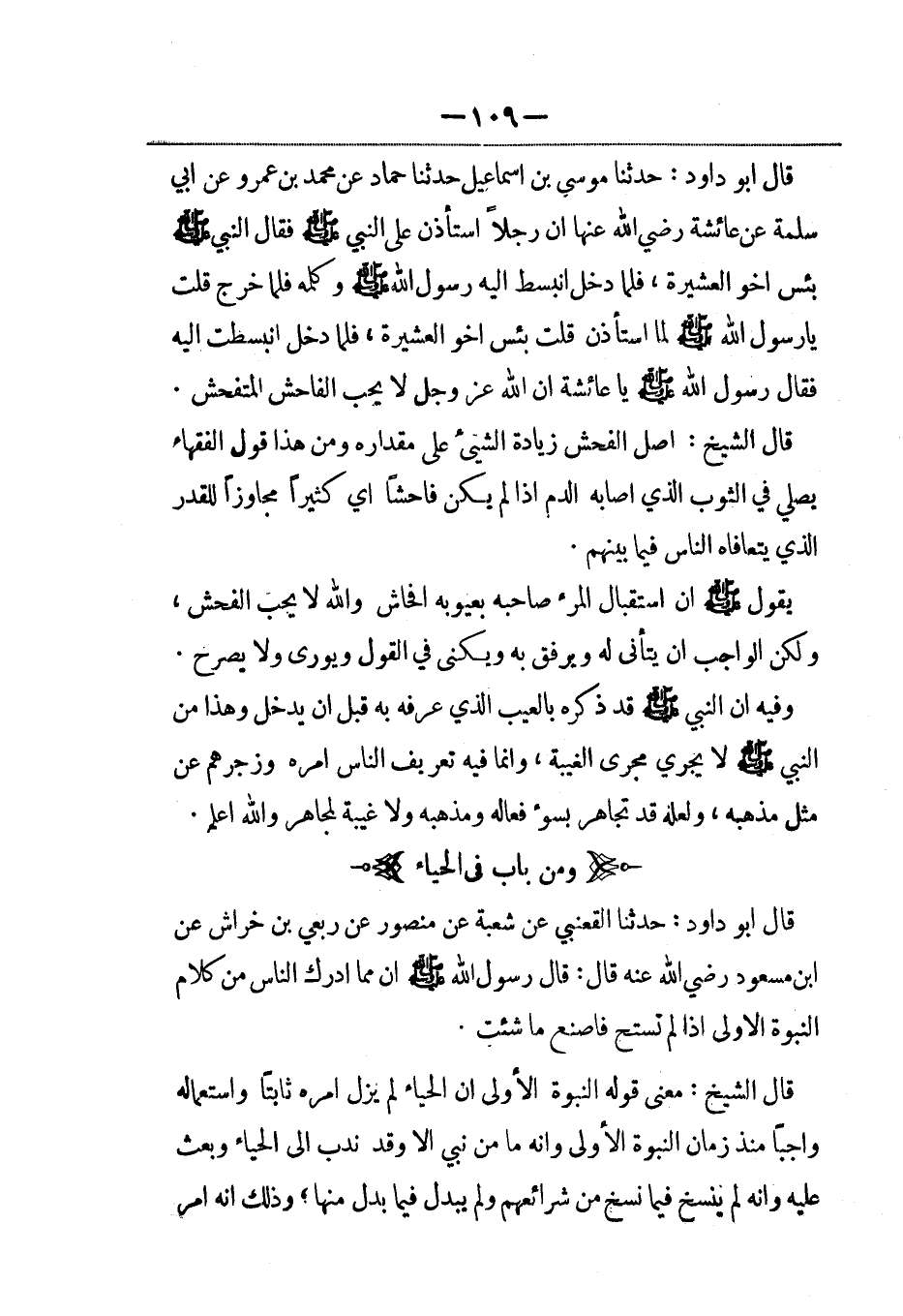 قال أبو داود: حدثنا القعنبي عن شعبة عن منصور عن رِبْعِيّ بنِ حِِرَاش عن ابن مسعود رضي الله عنه قال: قال رسول الله صلى الله عليه وسلم إن مما أدرك الناس من كلام النبوة الأولى إذا لم تستح فاصنع ما شئت.