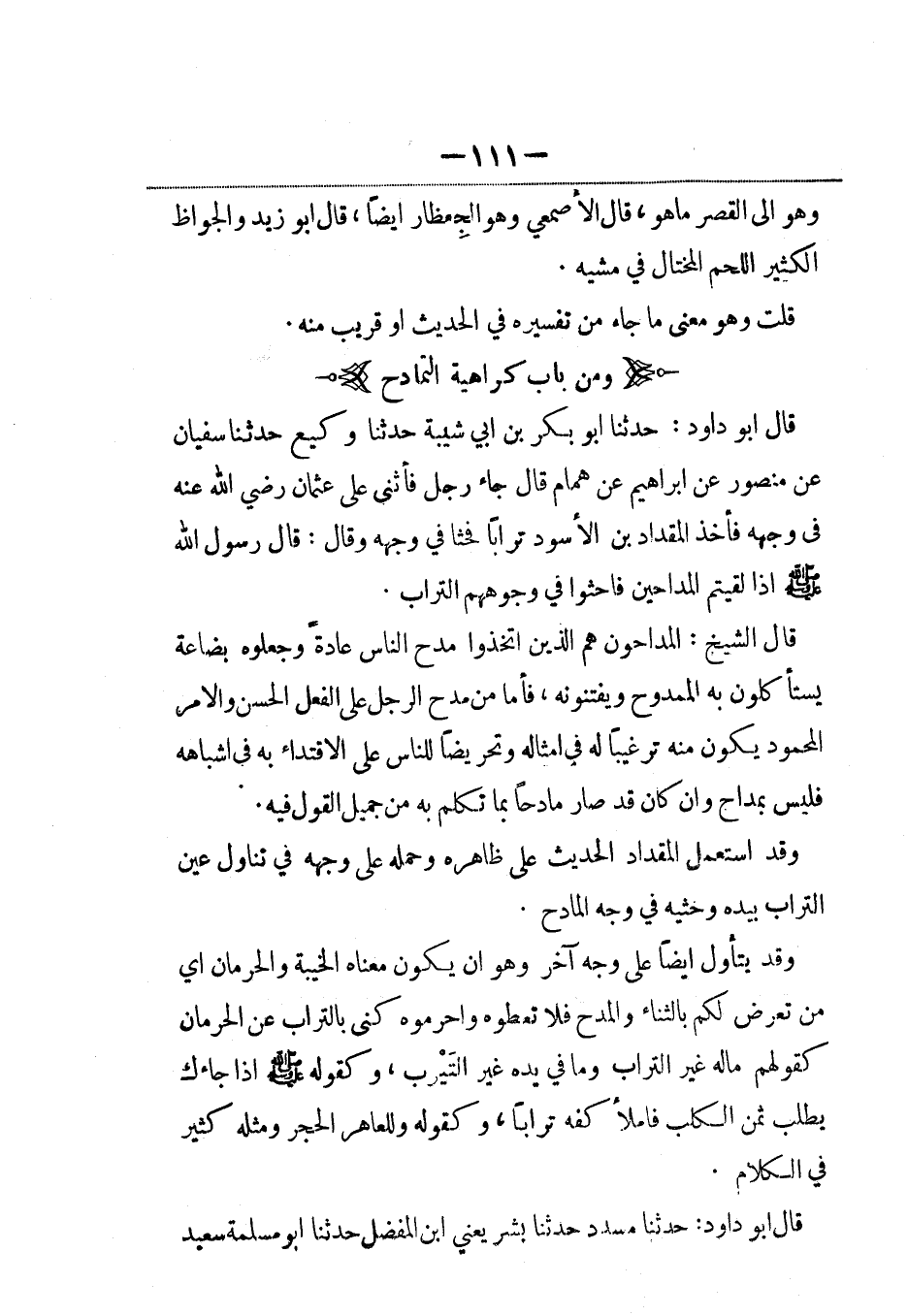 قال أبو داود: حدثنا أبو بكر بن أبي شيبة حدثنا وكيع حدثنا سفيان عن منصور عن إبراهيم عن همام قال جاء رجل فأثنى على عثمان رضي الله عنه في وجهه فأخذ المقداد بن الأسود تراباً فحثا في وجهه وقال: قال رسول الله صلى الله عليه وسلم إذا لقيتم المداحين فاحثوا في وجوههم التراب.