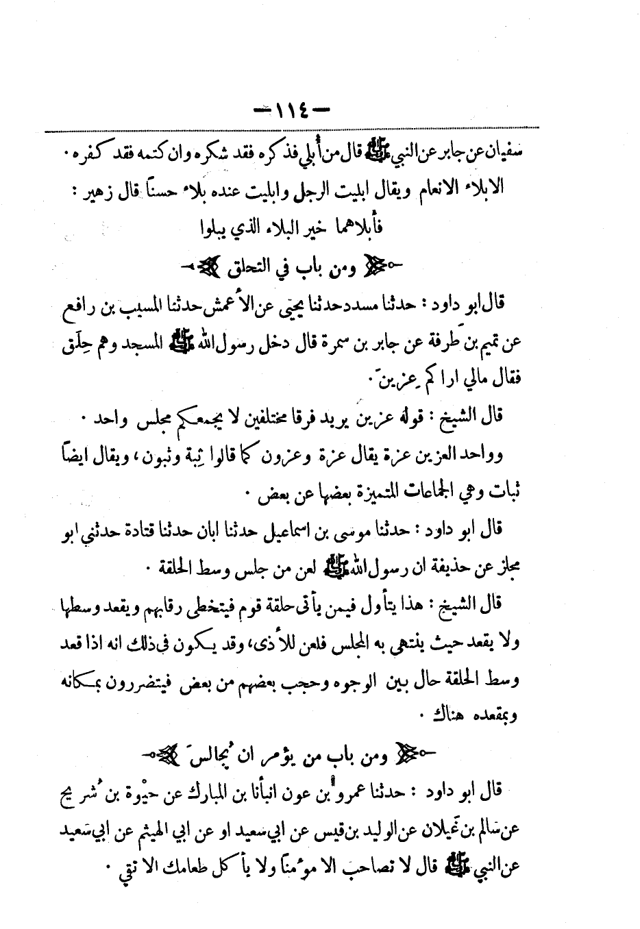 قال أبو داود: حدثنا مسدد حدثنا يحيى عن الأعمش حدثنا المسيب بن رافع عن تميم بن طَرفة عن جابر بن سمرة قال دخل رسول الله صلى الله عليه وسلم المسجد وهم حِلَق فقال ما لي أراكم عِزينَ.