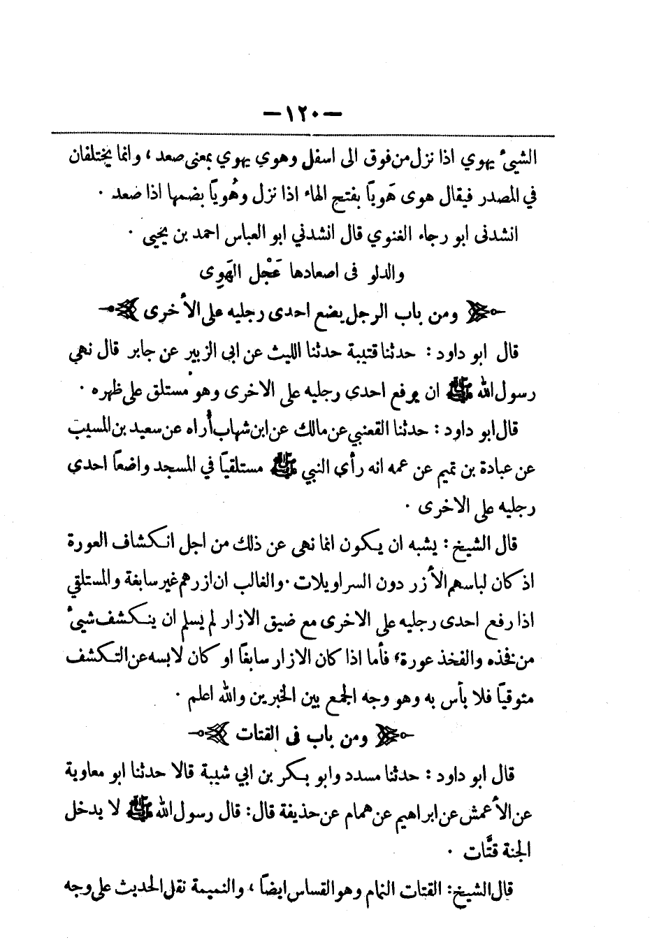قال أبو داود: حدثنا قتيبة حدثنا الليث، عَن أبي الزبير عن جابر قال نهى رسول الله صلى الله عليه وسلم أن يرفع إحدى رجليه على الأخرى وهو مستلق على ظهره.