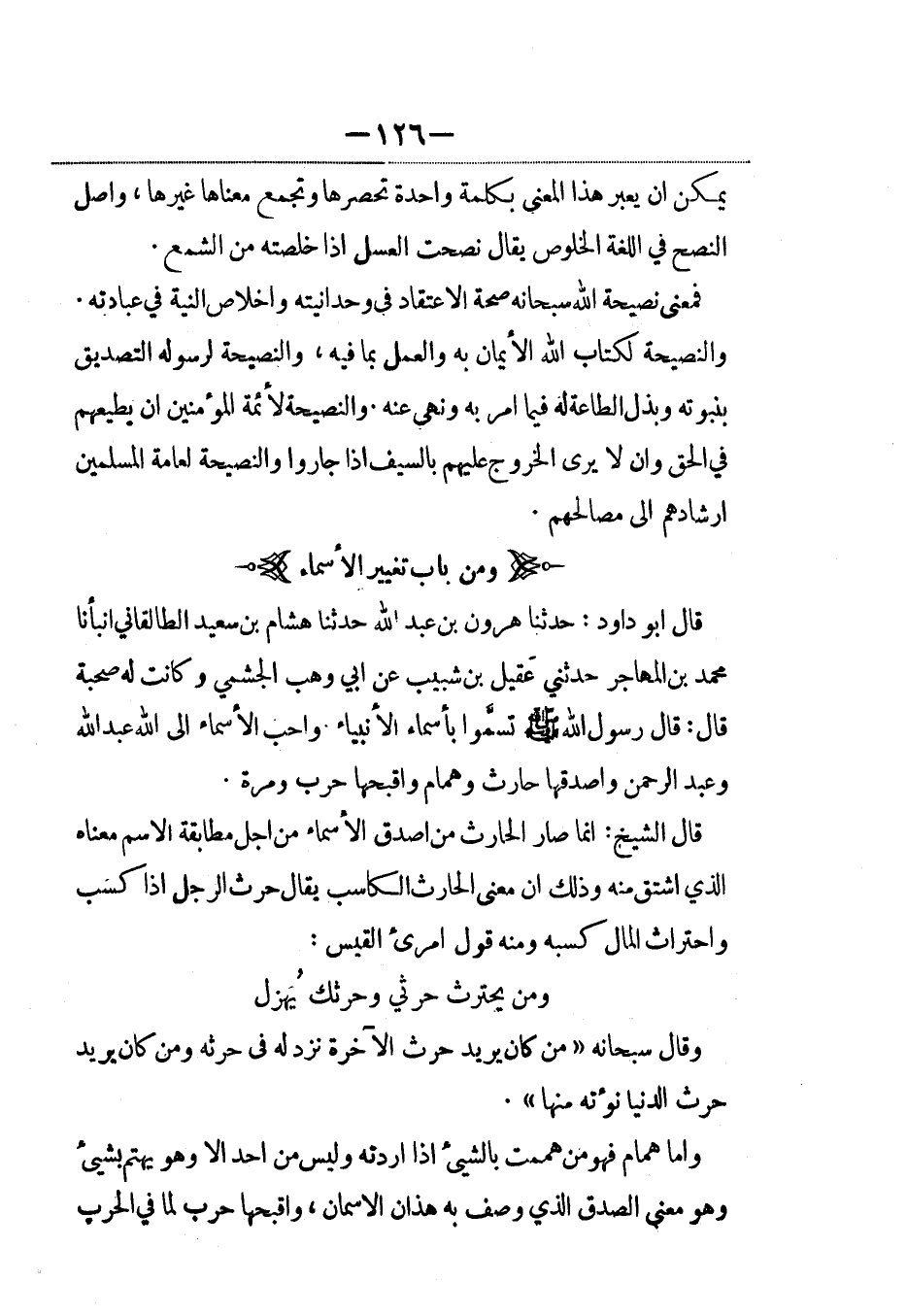قال أبو داود: حدثنا هارون بن عبد الله حدثنا هشام بن سعيد الطالقاني أنبأنا محمد بن المهاجر حدثني عقيل بن شبيب، عَن أبي وهب الجشمي وكانت له صحبة قال: قال رسول الله صلى الله عليه وسلم تسموا بأسماء الأنبياء وأحب الأسماء إلى الله عبد الله وعبد الرحمن وأصدقها حارث وهمام وأقبحها حرب ومرة.