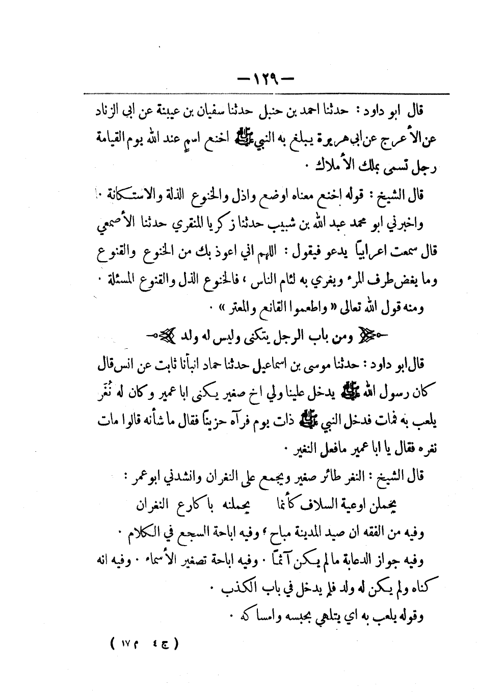قال أبو داود: حدثنا موسى بن إسماعيل حدثنا حماد أنبأنا ثابت عن أنس قال كان رسول الله صلى الله عليه وسلم يدخل علينا ولي أخ صغير يكنى أبا عمير وكان له نُغر يلعب به فمات فدخل النبي صلى الله عليه وسلم ذات يوم فرآه حزيناً فقال ما شأنه قالوا مات نغره فقال يا أبا عمير ما فعل النغير.