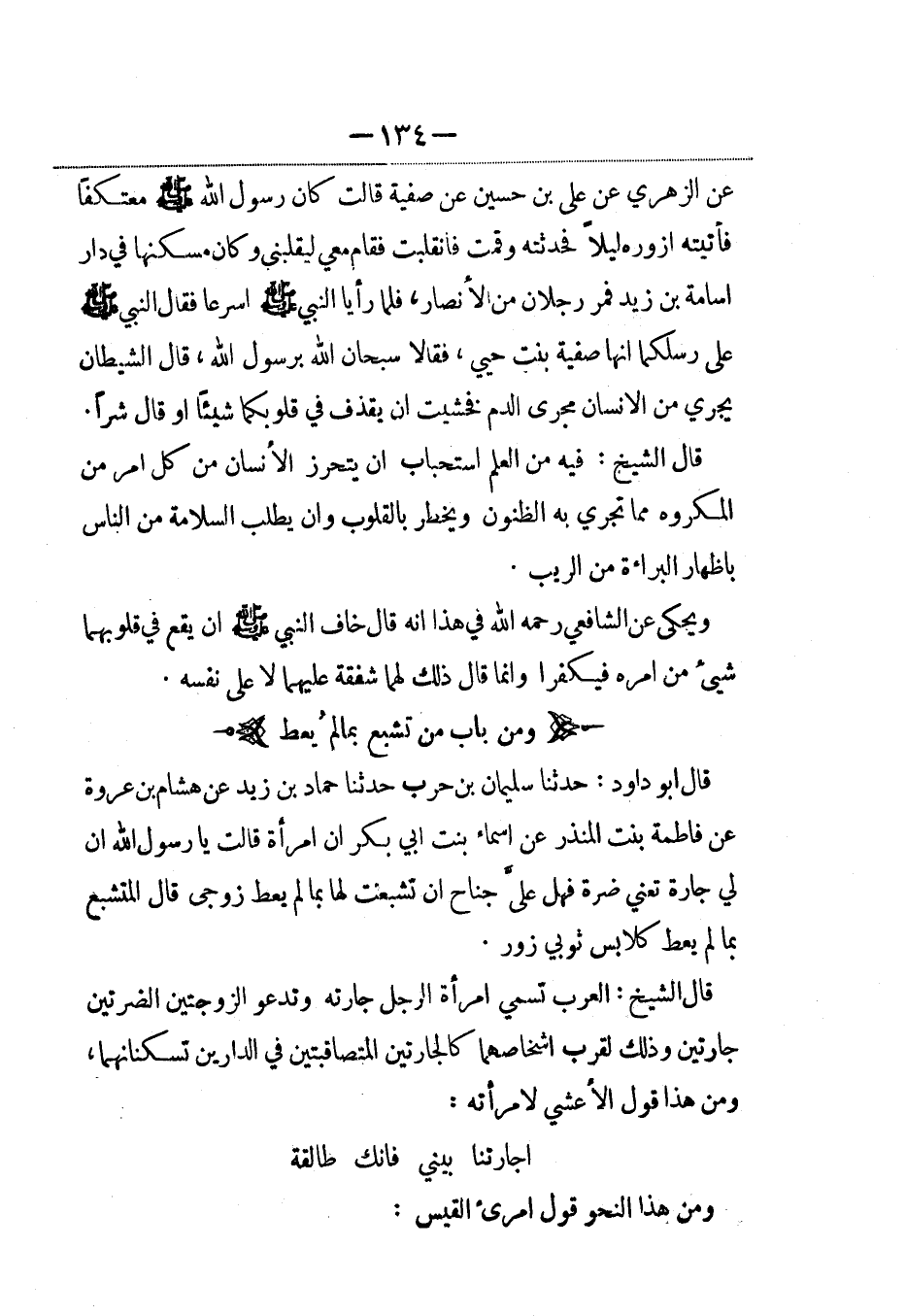 عن الزهري عن علي بن حسين عن صفية قالت كان رسول الله صلى الله عليه وسلم معتكفاً فأتيته أزوره ليلاً فحدثته وقمت فانقلبت فقام معي ليقلبني وكان مسكنها في دار أسامة بن زيد فمر رجلان من الأنصار، فلما رأيا النبي صلى الله عليه وسلم أسرعا فقال النبي صلى الله عليه وسلم: على رسلكما انها صفية بنت حيي، فقالا سبحان الله برسول الله، قال الشيطان يجري من الإنسان مجرى الدم فخشيت أن يقذف في قلوبكما شيئاً أو قال شراً.