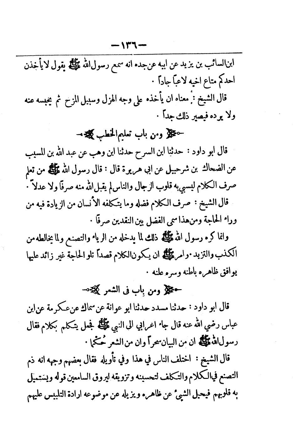 قال أبو داود: حدثنا ابن السرح حدثنا ابن وهب عن عبد الله بن المسيب عن الضحاك بن شرحبيل، عَن أبي هريرة قال: قال رسول الله صلى الله عليه وسلم: من تعلم صرف الكلام ليسبي به قلوب الرجال والناس لم يقبل الله منه صرفاً ولا عدلاً.