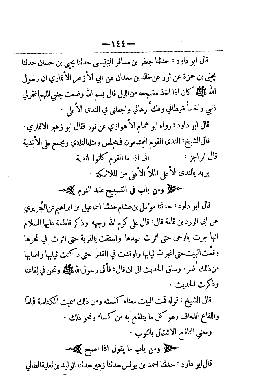 قال أبو داود: حدثنا جعفر بن مسافر التنيسي حدثنا يحيى بن حسان حدثنا يحيى بن حمزة عن ثور عن خالد بن معدان، عَن أبي الأزهر الأنماري أن رسول الله صلى الله عليه وسلم كان إذا أخذ مضجعه من الليل قال بسم الله وضعت جنبي اللهم اغفر لي ذنبي واخسأ شيطاني وفكَّ رهاني واجعلني في الندى الأعلى.