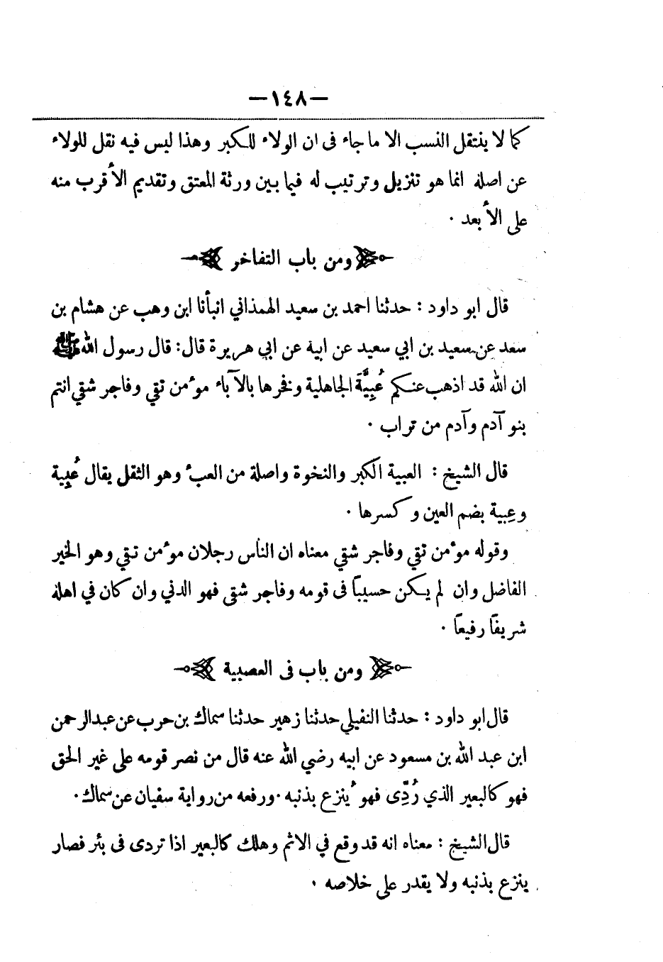 قال أبو داود: حدثنا أحمد بن سعيد الهمذاني أنبأنا ابن وهب عن هشام بن سعد عن سعيد بن أبي سعيد عن أبيه، عَن أبي هريرة قال: قال رسول الله صلى الله عليه وسلم: إن الله قد أذهب عنكم عُبِيَّة الجاهلية وفخرها بالآباء مؤمن تقي وفاجر شقي أنتم بنو آدم وآدم من تراب.