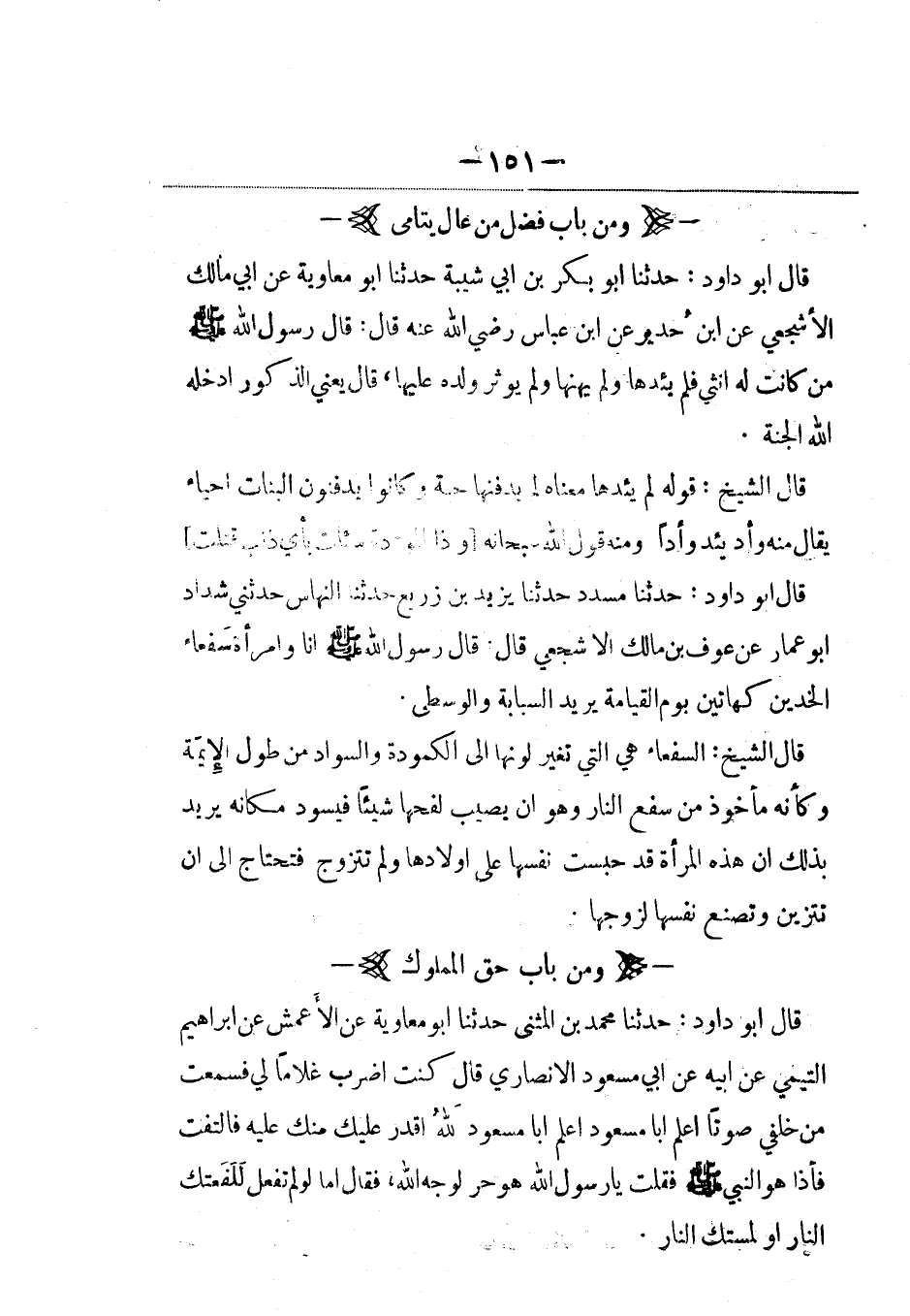 قال أبو داود: حدثنا أبو بكر بن أبي شيبة حدثنا أبو معاوية، عَن أبي مالك الأشجعي عن ابن حُدير عن ابن عباس رضي الله عنهما قال: قال رسول الله صلى الله عليه وسلم: من كانت له أنثى فلم يئدها ولم يهنها ولم يؤثر ولده عليها، قال، يَعني الذكور ادخله الله الجنة.