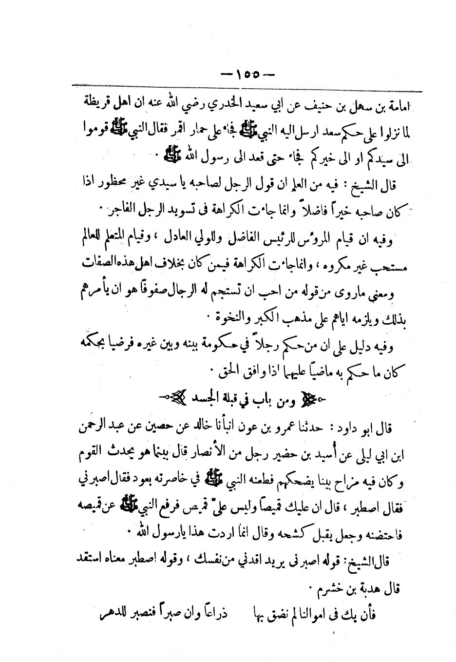 قال أبو داود: حدثنا عمرو بن عون أنبأنا خالد عن حصين عن عبد الرحمن بن أبي ليلى عن أسيد بن حضير رجل من الأنصار قال بينما هو يحدث القوم وكان فيه مزاح بيننا يضحكهم فطعنه النبي صلى الله عليه وسلم في خاصرته بعود فقال أصبرني فقال اصطبر، قال ان عليك قميصاً وليس عليّ قميص فرفع النبي صلى الله عليه وسلم عن قميصه فاحتضه وجعل يقبل كشحه وقال إنما أردت هذا يا رسول الله.