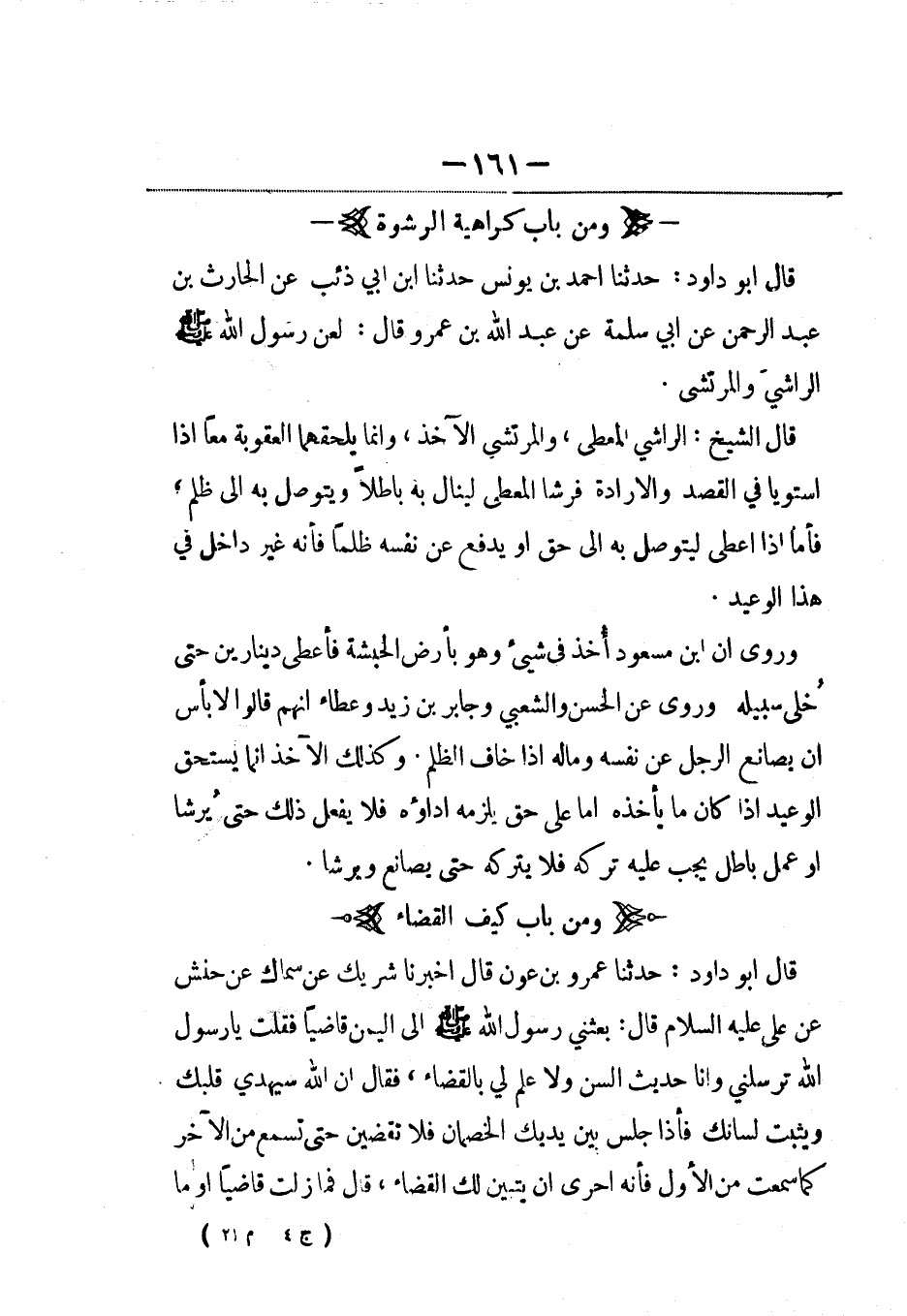 قال أبو داود: حدثنا أحمد بن يونس حدثنا ابن أبي ذئب عن الحارث بن عبد الرحمن، عَن أبي سلمة عن عبد الله بن عمرو قال: لعن رسول الله صلى الله عليه وسلم الراشي والمرتشي.