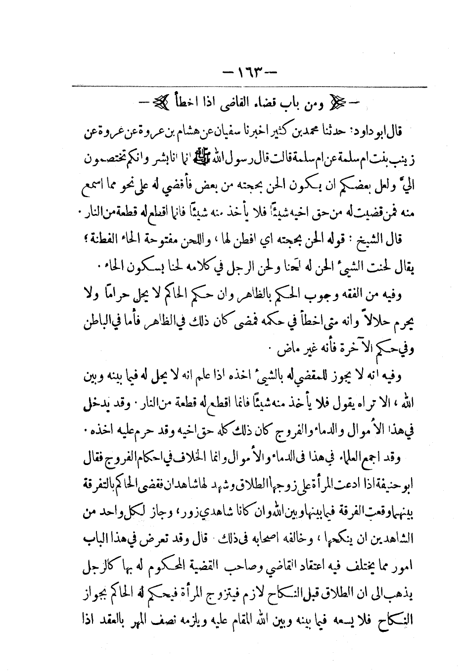 قال أبو داود: حدثنا محمد بن كثير أخبرنا سفيان عن هشام بن عروة عن عروة عن زينب بنت أم سلمة عن أم سلمة قالت قال رسول الله صلى الله عليه وسلم: إنما أنا بشر وإنكم تختصمون إليَّ ولعل بعضكم أن يكون ألحن بحجته من بعض فأقضي له على نحو مما أسمع منه فمن قضيت له من حق أخيه شيئاً فلا يأخذ منه شيئاً فإنما أقطع له قطعة من النار.