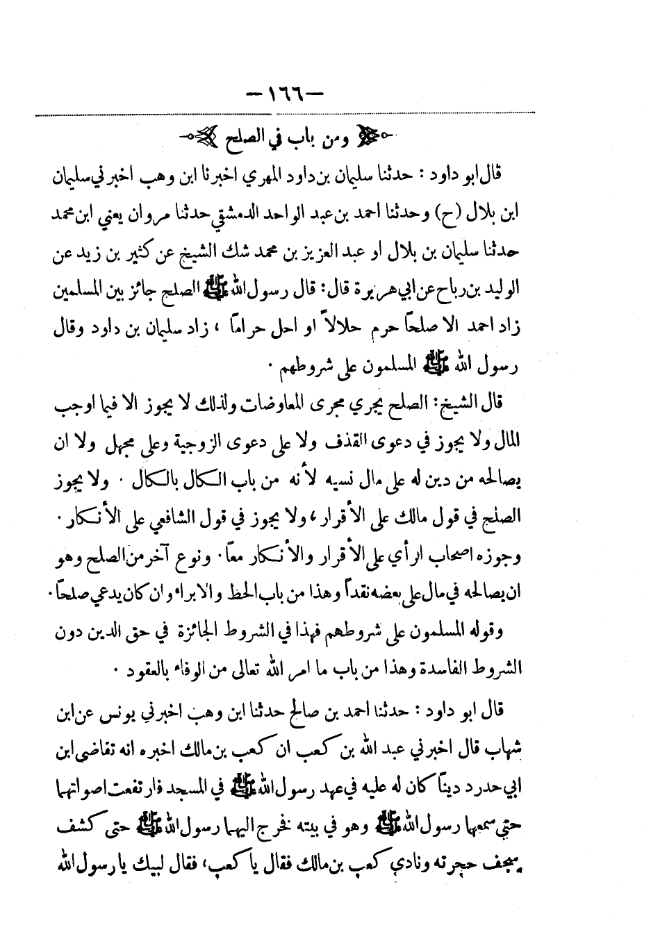 قال أبو داود: حدثنا سليمان بن داود المهري أخبرنا ابن وهب أخبرني سليمان بن بلال (ح) وحدثنا أحمد بن عبد الواحد الدمشقي حدثنا مروان، يَعني ابن محمد حدثنا سليمان بن بلال أو عبد العزيز بن محمد شك الشيخ عن كثير بن زيد عن الوليد بن رباح، عَن أبي هريرة قال: قال رسول الله صلى الله عليه وسلم: الصلح جائز بين المسلمين زاد أحمد إلاّ صلحاً حرم حلالاً أو أحل حراماً، زاد سليمان بن داود وقال رسول الله صلى الله عليه وسلم: المسلمون على شروطهم.