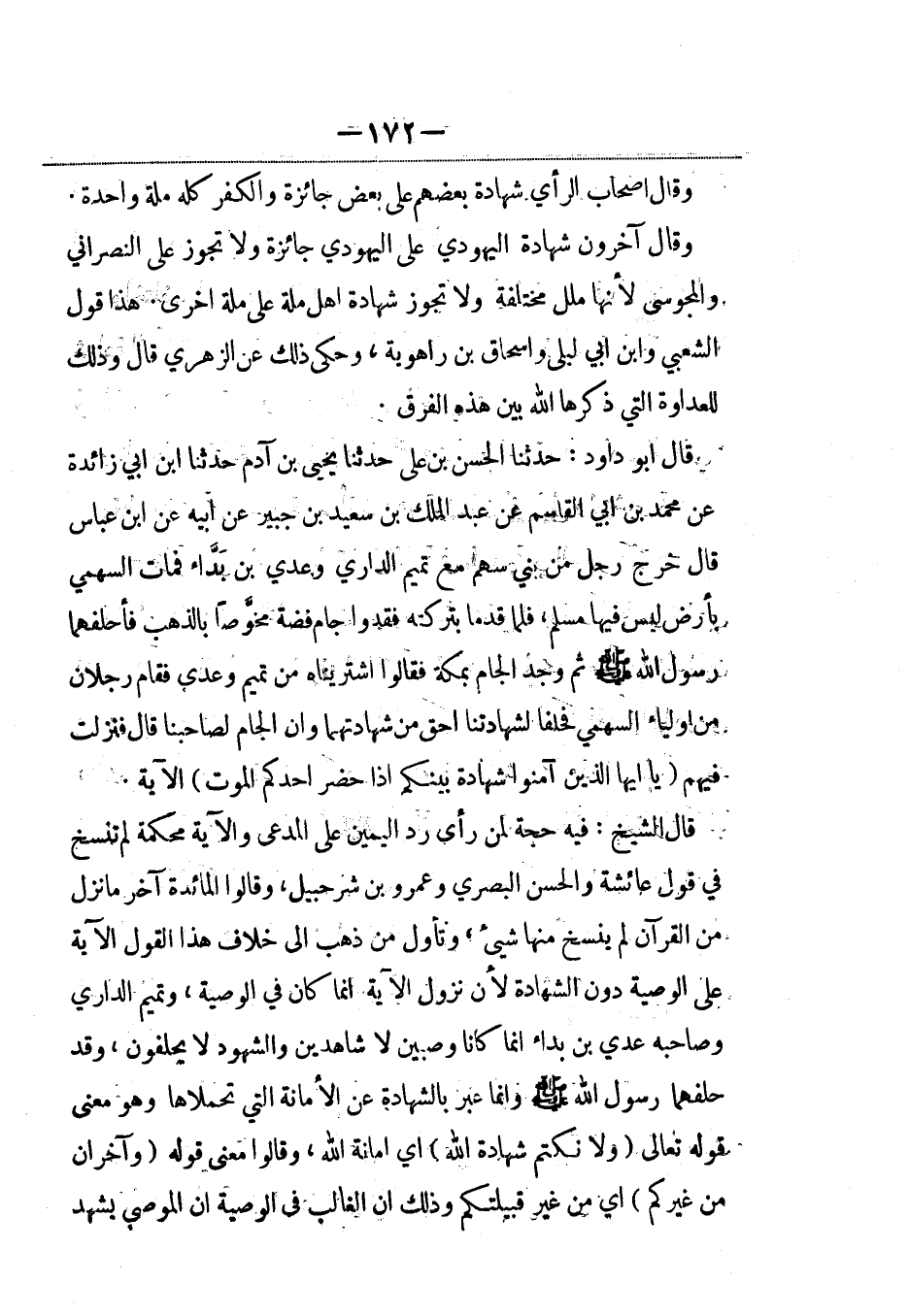 قال الشيخ: فيه حجة لمن رأى رد اليمين على المدعي والآية محكمة لم تنسخ في قول عائشة والحسن البصري وعمرو بن شرحبيل، وقالوا المائدة آخر ما نزل من القرآن لم ينسخ منها شيء؛ وتأول من ذهب إلى خلاف هذا القول الآيه على الوصية دون الشهادة لأن نزول الآية إنما كان في الوصية، وتميم الدارى وصاحبه عدي بن بداء إنما كانا وصيين لا شاهدين والشهود لا يحلفون، وقد حلفهما رسول الله صلى الله عليه وسلم وإنما عبر بالشهادة عن الأمانة التي تحملاها وهو معنى قوله تعالى {ولا نكتم شهادة الله} [المائدة: 106] أي أمانة الله، وقالوا معنى قوله {أو آخران من غيركم} [المائدة: 06 1] أي من غير قبيلتكم وذلك أن الغالب في الوصية أن الموصي يشهد