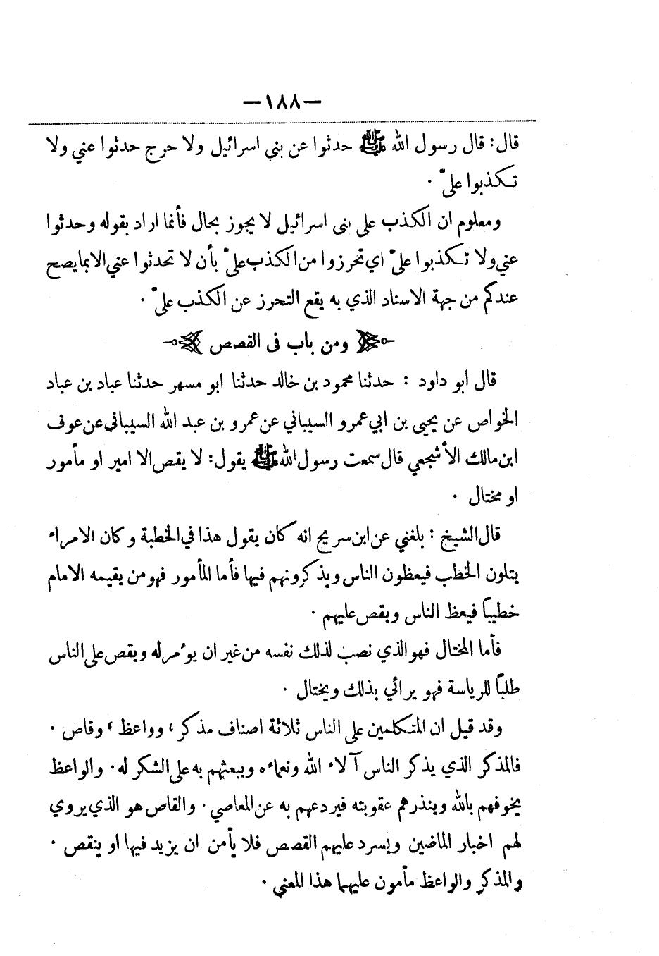 قال أبو داود: حدثنا محمود بن خالد حدثنا أبو مسهر حدثنا عباد بن عباد الخواص عن يحيى بن أبي عمرو السيباني عن عمرو بن عبد الله السيباني عن عوف بن مالك الأشجعي قال سمعت رسول الله صلى الله عليه وسلم يقول: لا يقص إلاّ أمير أو مأمور أو مختال.