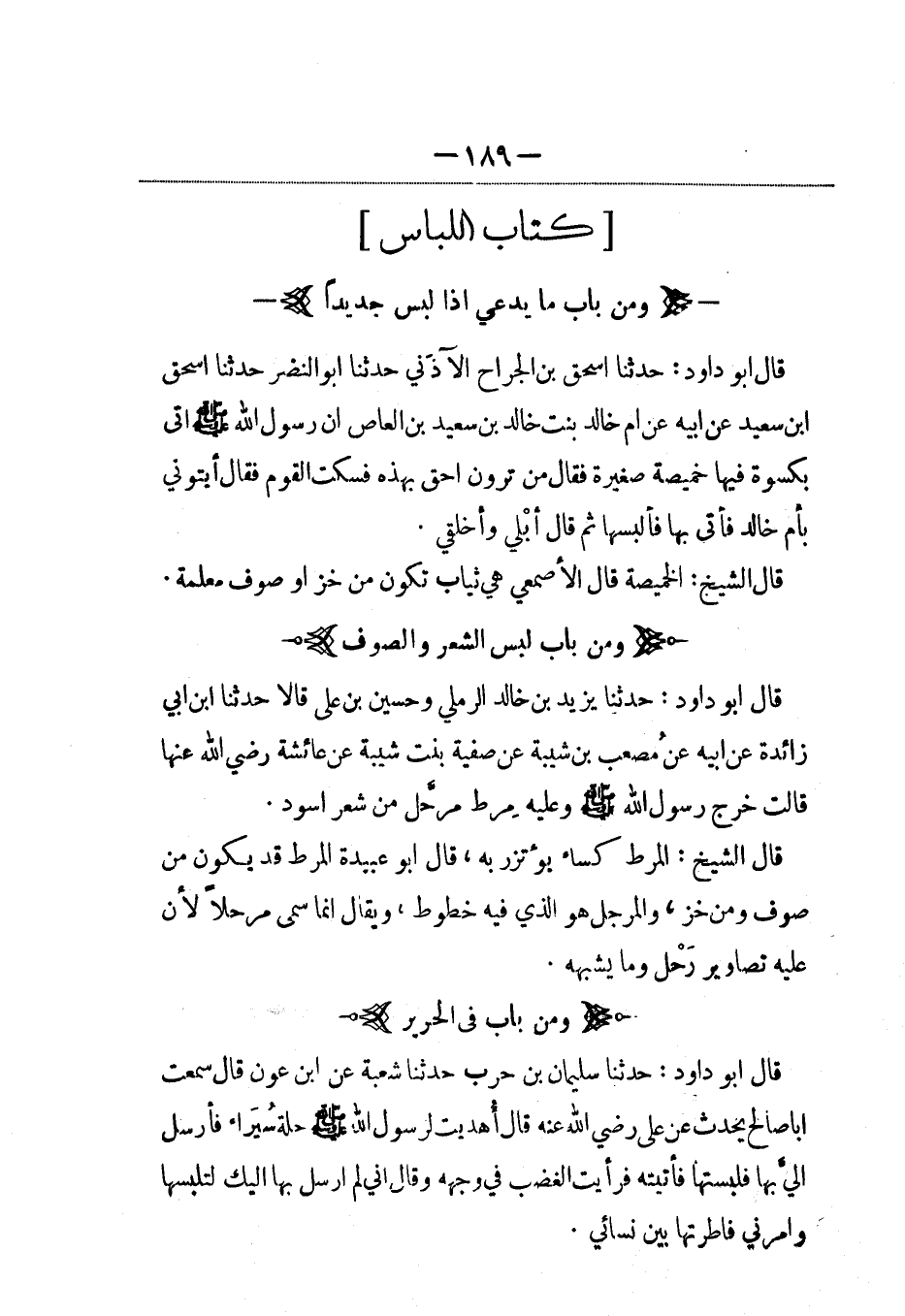 قال أبو داود: حدثنا يزيد بن خالد الرملي وحسين بن علي قالا: حَدَّثنا ابن أبي زائدة عن أبيه عن مصعب بن شيبة عن صفية بنت شيبة عن عائشة رضي الله عنها قالت خرج رسول الله صلى الله عليه وسلم وعليه مِرط مرحَّل من شعر أسود.