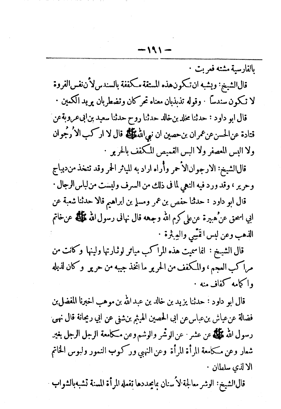 قال أبو داود: حدثنا مخلد بن خالد حدثنا روح حدثنا سعيد بن أبي عروبة عن قتادة عن الحسن عن عمران بن حصين أن نبى الله صلى الله عليه وسلم قال لا اركب الأُرجُوان ولا ألبس المعصفر ولا ألبس القميص المكفف بالحرير.