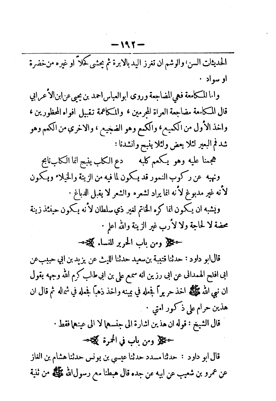 قال أبو داود: حدثنا قتيبة بن سعيد حدثنا الليث عن يزيد بن أبي حبيب، عَن أبي أفلح الهمداني، عَن أبي رزين أنه سمع علي بن أبي طالب كرم الله وجهه يقول إن نبي الله صلى الله عليه وسلم أخذ حريراً فجعله في يمينه وأخذ ذهباً فجعله في شماله ثم قال إن هذين حرام على ذكور أمتي.