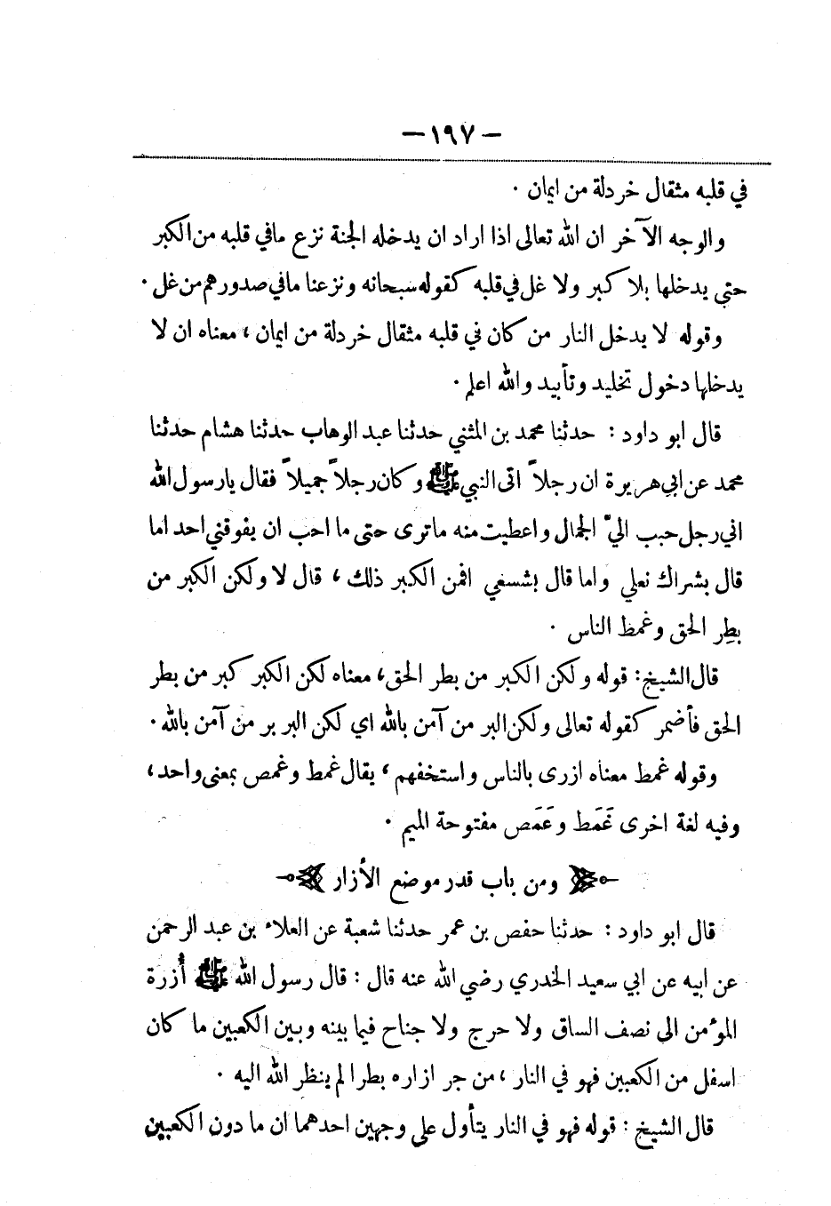 قال أبو داود: حدثنا حفص بن عمر حدثنا شعبة عن العلاء بن عبد الرحمن عن أبيه، عَن أبي سعيد الخدري رضي الله عنه قال: قال رسول الله صلى الله عليه وسلم أُزرة المؤمن إلى نصف الساق ولا حرج ولا جناح فيما بينه وبين الكعبين ما كان أسفل من الكعبين فهو في النار، من جر إزاره بطراً لم ينظر الله إليه.