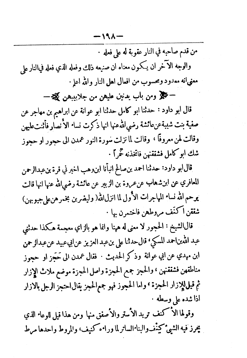 قال أبو داود: حدثنا أبو كامل حدثنا أبو عَوانة عن إبراهيم بن مهاجر عن صفية بنت شيبة عن عائشة رضي الله عنها أنها ذكرت نساء الأنصار فأثنت عليهن وقالت لهن معروفاً، وقالت لما نزلت سورة النور عمدن إلى حجور أو حجوز شك أبو كامل فشققنهن فاتخذنه خُمُراً.
