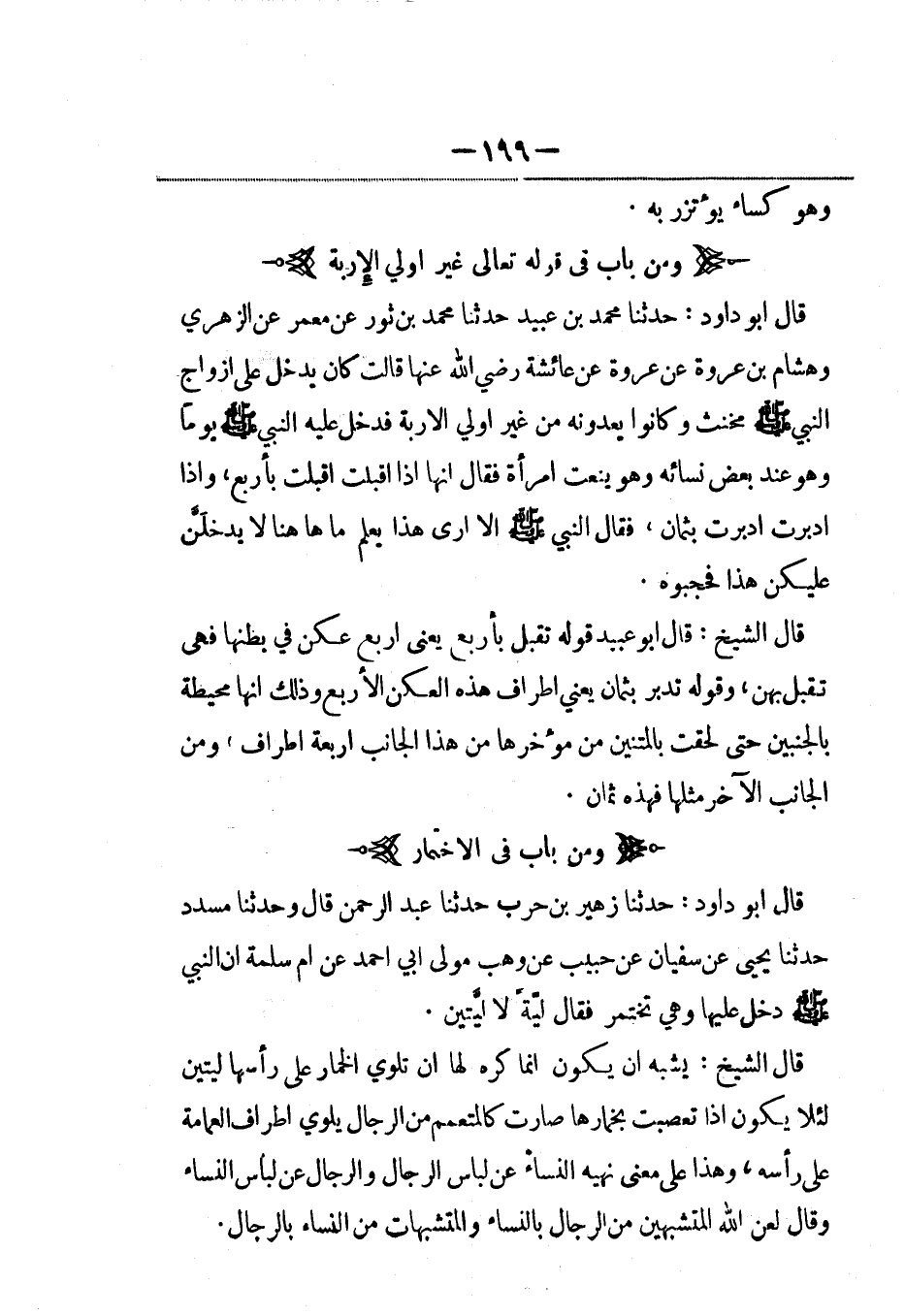 قال أبو داود: حدثنا محمد بن عبيد حدثنا محمد بن ثور عن معمر عن الزهري وهشام بن عروة عن عروة عن عائشة رضي الله عنها قالت كان يدخل على أزواج النبي صلى الله عليه وسلم مخنث وكانوا يعدونه من غير أولي الاربة فدخل عليه النبي صلى الله عليه وسلم يوماً وهو عند بعض نسائه وهو ينعت امرأة فقال إنها إذا أقبلت أقبلت بأربع، وإذا أدبرت أدبرت بثمان، فقال النبي صلى الله عليه وسلم ألا أرى هذا يعلم ما ها هنا لا يدخلنَّ عليكن هذا فحجبوه.