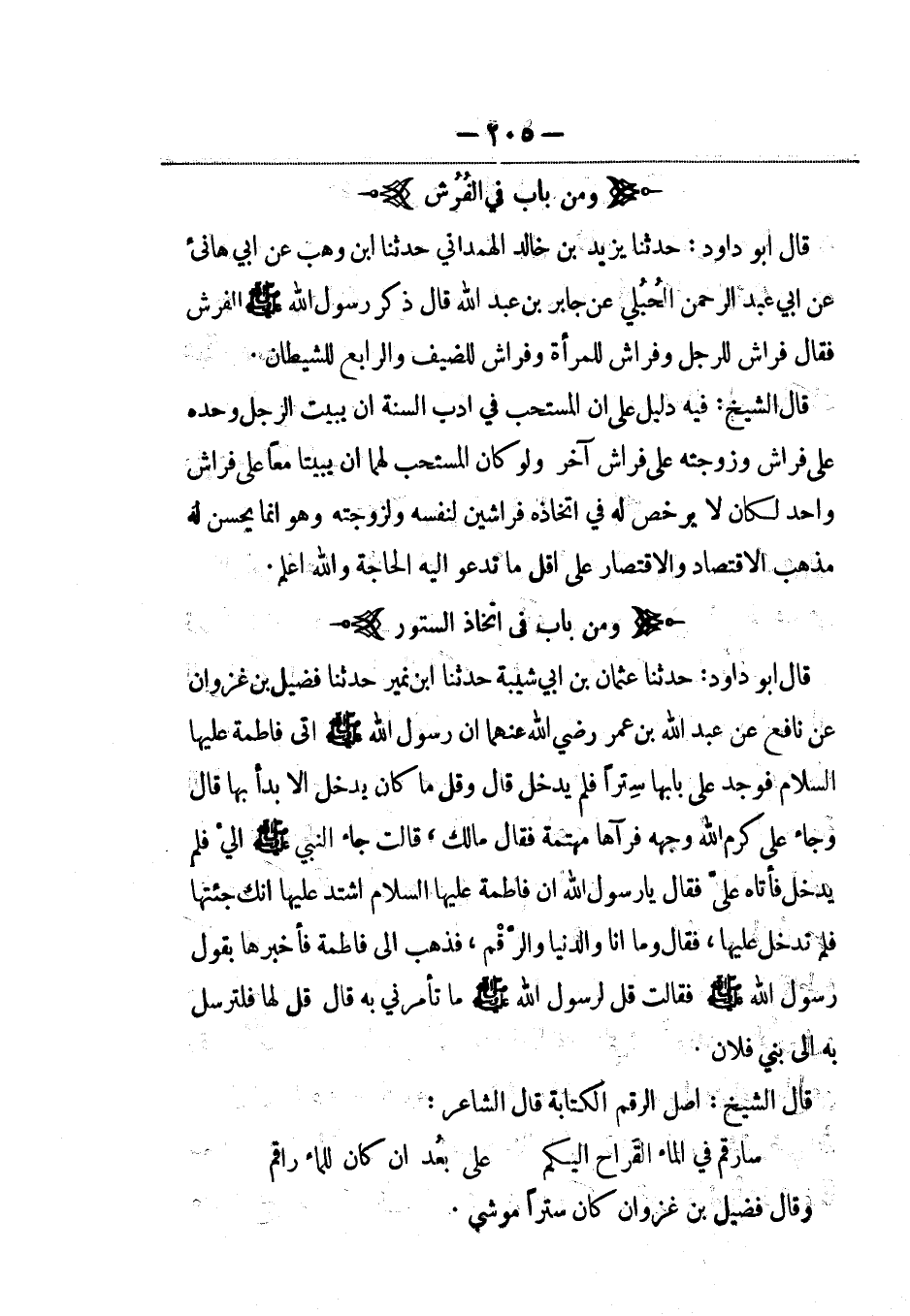 قال أبو داود: حدثنا عثمان بن أبي شيبة حدثنا ابن نمير حدثنا فضيل بن غزوان عن نافع عن عبد الله بن عمر رضي الله عنهما أن رسول الله صلى الله عليه وسلم أتى فاطمة عليها السلام فوجد على بابها سِتراً فلم يدخل. قال وقل ما كان يدخل إلاّ بدأ بها قال وجاء علي كرم الله وجهه فرآها مهتمة فقال مالك، قالت جاء النبي صلى الله عليه وسلم إلي فلم يدخل فأتاه علي فقال يا رسول الله إن فاطمة عليها السلام اشتد عليها أنك جئتها فلم تدخل عليها، فقال وما أنا والدنيا والرقْم، فذهب إلى فاطمة فأخبرها بقول رسول الله صلى الله عليه وسلم فقالت قل لرسول الله صلى الله عليه وسلم ما تأمرني به قال قل لها فلترسل به إلى بني فلان.