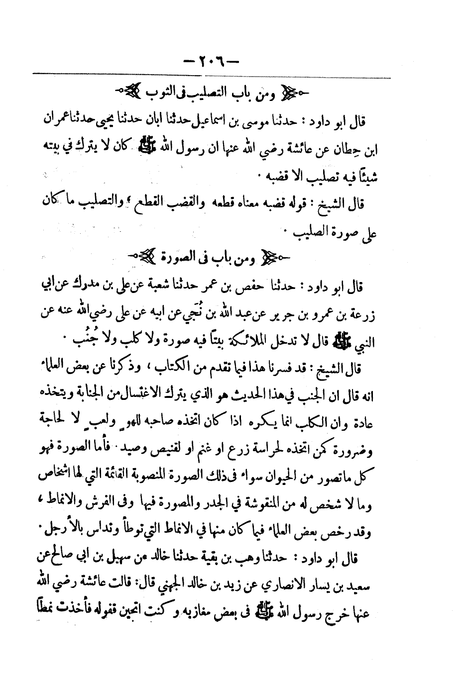 قال أبو داود: حدثنا موسى بن إسماعيل حدثنا أبان حدثنا يحيى حدثنا عمران بن حِطان عن عائشة رضي الله عنها أن رسول الله صلى الله عليه وسلم كان لا يترك في بيته شيئاً فيه تصليب إلاّ قضبه.