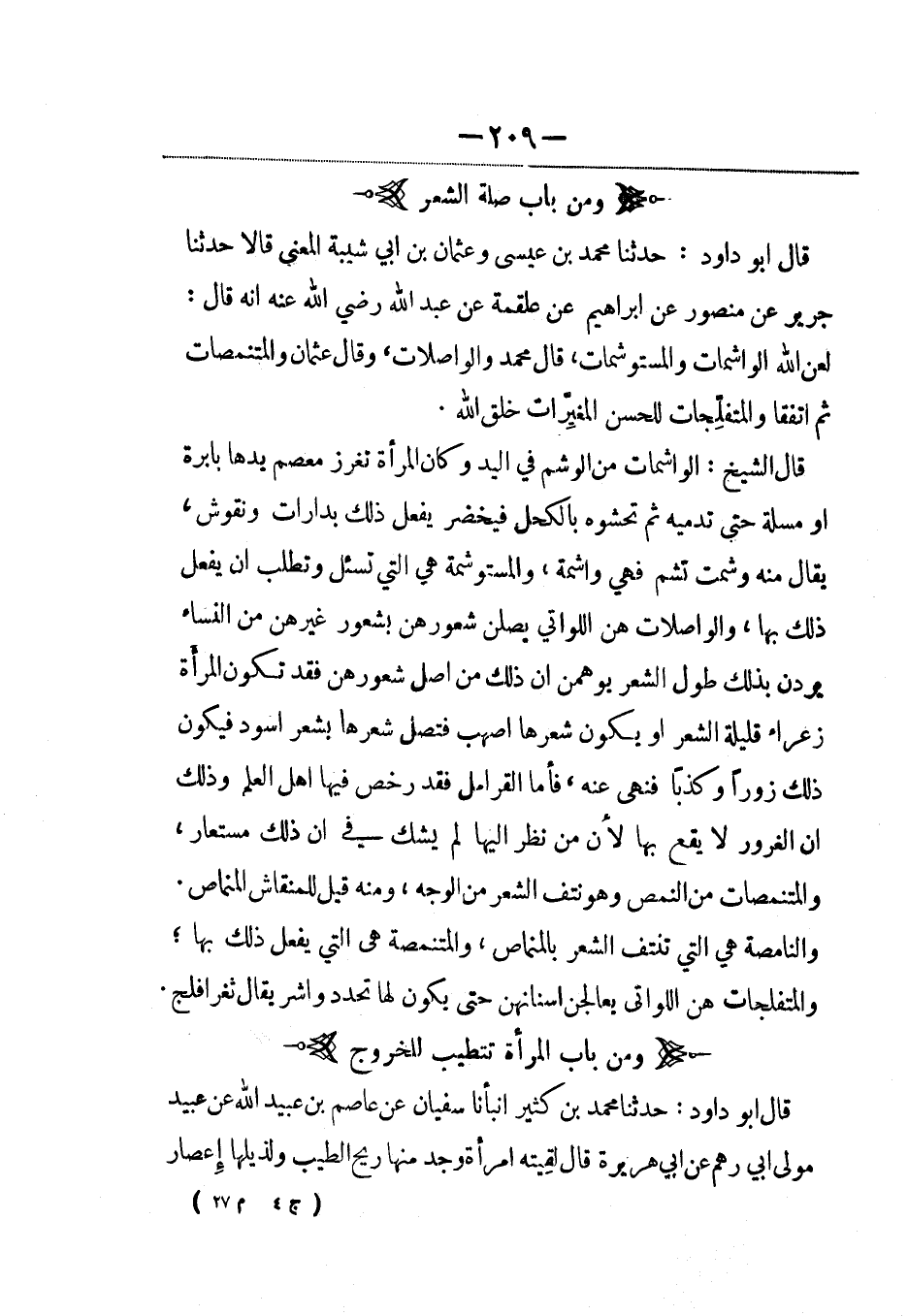 قال أبو داود: حدثنا محمد بن عيسى وعثمان بن أبي شيبة المعنى قالا: حَدَّثنا جرير عن منصور عن إبراهيم عن علقمة عن عبد الله رضي الله عنه أنه قال: لعن الله الواشمات والمستوشمات، قال محمد والواصلات، وقال عثمان والمتنمصات ثم اتفقا والمتفلِّجات للحسن المغيِّرات خلق الله.