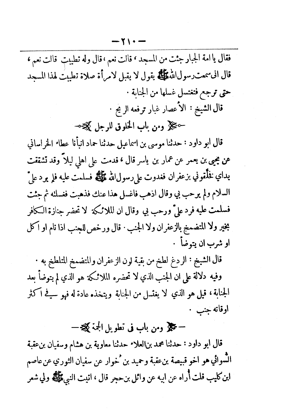 قال أبو داود: حدثنا موسى بن إسماعيل حدثنا حماد أنبأنا عطاء الخراساني عن يحيى بن يعمر عن عمار بن ياسر قال: قدمت على أهلي ليلاً وقد تشققت يداي فخلَّقوني بزعفران فغدوت على رسول الله صلى الله عليه وسلم فسلمت عليه فلم يرد عليَّ السلام ولم يرحب بي وقال اذهب فاغسل هذا عنك فذهبت فغسلته ثم جئت فسلمت عليه فرد عليَّ ورحب بي وقال إن الملائكة لا تحضر جنازة الكافر بخير ولا المتضمخ بالزعفران ولا الجنب. قال ورخص للجنب إذا نام أو أكل أو شرب أن يتوضأ.