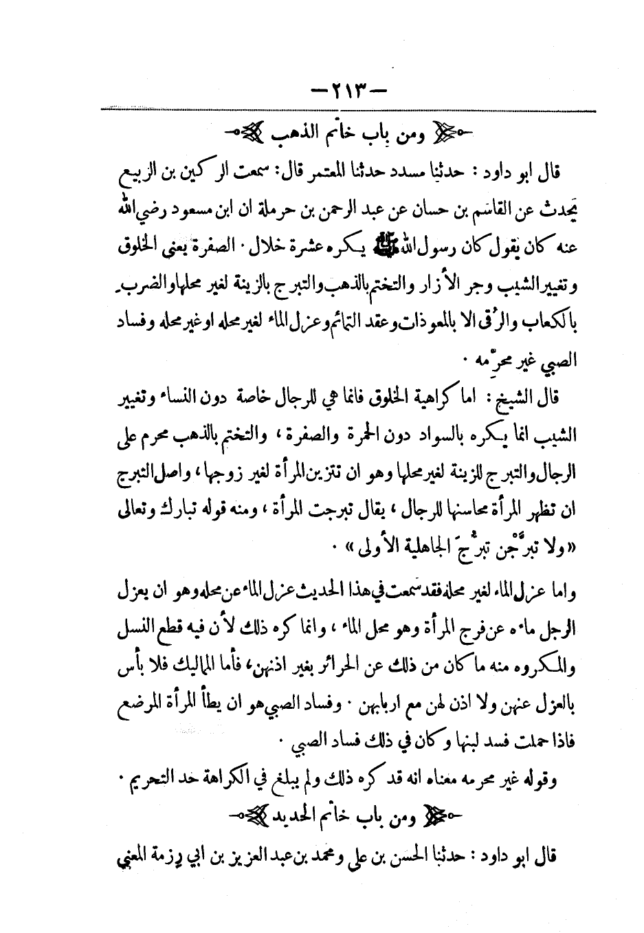 قال أبو داود: حدثنا مسدد حدثنا المعتمر قال: سمعت الركين بن الربيع يحدث عن القاسم بن حسان عن عبد الرحمن بن حرملة أن ابن مسعود رضي الله عنه كان يقول كان رسول الله صلى الله عليه وسلم يكره عشرة خلال. الصفرة، يَعني الخلوق وتغيير الشيب وجر الإزار والتختم بالذهب والتبرج بالزينة لغير محلها والضرب بالكعاب والرُّقى إلاّ بالمعوذات وعقد التمائم وعزل الماء لغير محله أو غير محله وفساد الصبي غير محرِّمه.