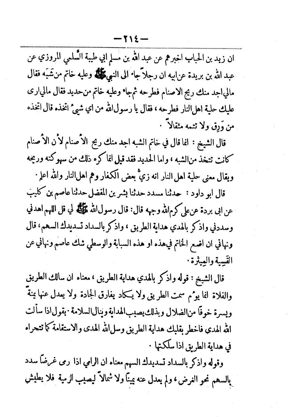 قال أبو داود: حدثنا مسدد حدثنا بشر بن المفضل حدثنا عاصم بن كليب، عَن أبي بردة عن علي كرم الله وجهه قال: قال رسول الله صلى الله عليه وسلم لي قل اللهم اهدني وسددني واذكر بالهدي هداية الطريق، واذكر بالسداد تسديدك السهم، قال ونهاني أن أضع الخاتم في هذه أو هذه السبابة والوسطى شك عاصم ونهاني عن القَسِية والمِيثرة.