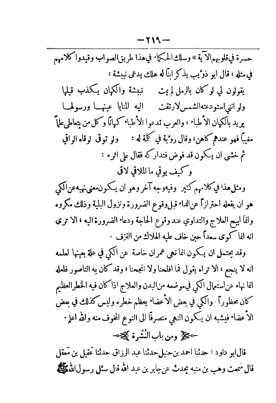 وقد يحتمل أن يكون إنما نهى عمران خاصة عن الكي في علة بعينها لعلمه أنه لا ينجع، ألا تراه يقول فما أفلحنا ولا أنجحنا، وقد كان به الناصور فلعله إنما نهاه عن استعمال الكي في موضعه من البدن والعلاج إذا كان فيه الخطر العظيم كان محظوراً والكي في بعض الأعضاء يعظم خطره وليس كذلك في بعض الأعضاء فيشبه أن يكون النهي منصرفاً إلى النوع المخوف منه والله أعلم.