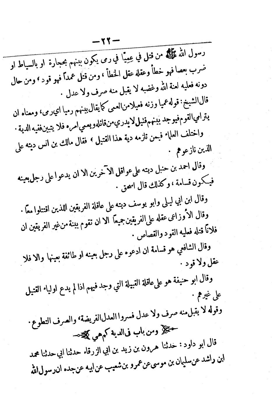 رسول الله صلى الله عليه وسلم من قتل في عِمِيّا في رمي يكون بينهم بحجارة أو بالسياط أو ضرب بعصا فهو خطأ وعقله عقل الخطأ، ومن قتل عمداً فهو قود، ومن حال دونه فعليه لعنة الله وغضبه لا يقبل منه صرف ولا عدل.