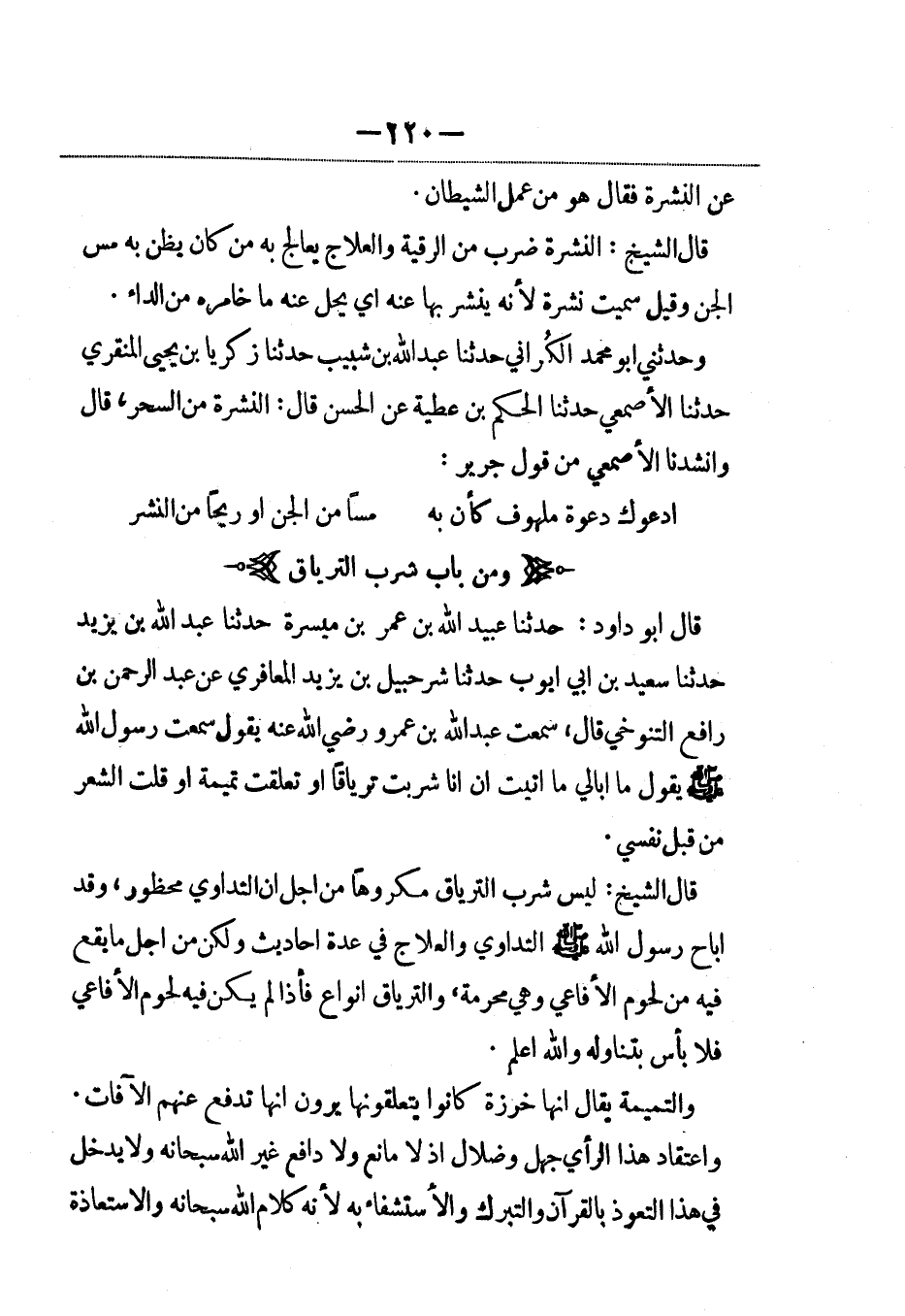 قال أبو داود: حدثنا عبيد الله بن عمر بن ميسرة حدثنا عبد الله بن يزيد حدثنا سعيد بن أبي أيوب حدثنا شرحبيل بن يزيد المعافري عن عبد الرحمن بن رافع التنوخي قال: سمعت عبد الله بن عمرو رضي الله عنه يقول: سمعت رسول الله صلى الله عليه وسلم يقول: ما أبالي ما أتيت إن أنا شربت ترياقاً أو تعلقت تميمة أو قلت الشعر من قبل نفسي.