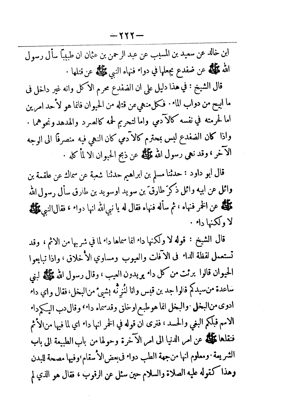 قال أبو داود: حدثنا مسلم بن إبراهيم حدثنا شعبة عن سماك عن علقمة بن وائل عن أبيه وائل ذكرَ طارقَ بن سويد أو سويد بن طارق سأل رسول الله صلى الله عليه وسلم عن الخمر فنهاه، ثم سأله فنهاه فقال له يا نبي الله إنها دواء، فقال النبي صلى الله عليه وسلم: لا ولكنها داء.
