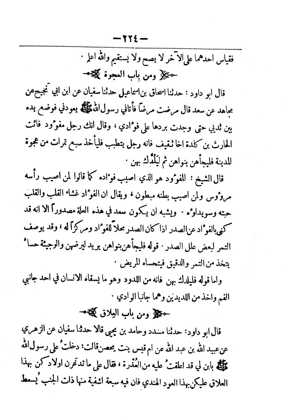 قال أبو داود: حدثنا إسحاق بن إسماعيل حدثنا سفيان عن ابن أبي نَجيح عن مجاهد عن سعد قال: مرضت مرضاً فأتاني رسول الله صلى الله عليه وسلم يعودني فوضع يده بين ثديي حتى وجدت بردها على فؤادي، وقال: إنك رجل مفؤود فائت الحارث بن كلدة أخا ثقيف فإنه رجل يتطبب فليأخذ سبع تمرات من عجوة المدينة فليجأهن بنواهن ثم ليَلُدَّك بهن.