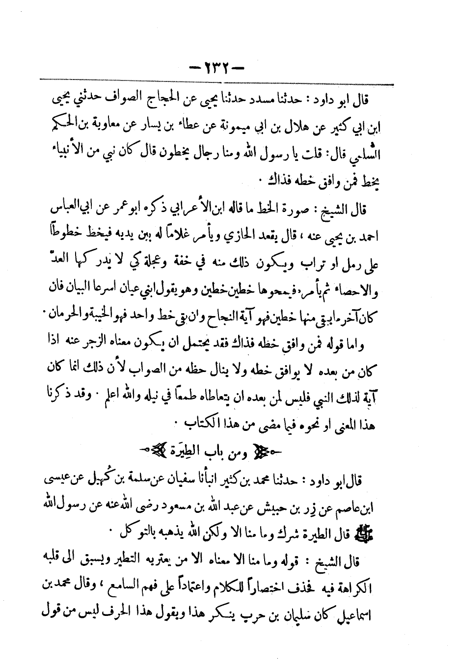 قال أبو داود: حدثنا محمد بن كثير أنبأنا سفيان عن سلمة بن كُهيل عن عيسى بن عاصم عن زِر بن حبيش عن عبد الله بن مسعود رضي الله عنه عن رسول الله صلى الله عليه وسلم قال: الطيرة شرك وما منا إلاّ ولكن الله يذهبه بالتوكل.