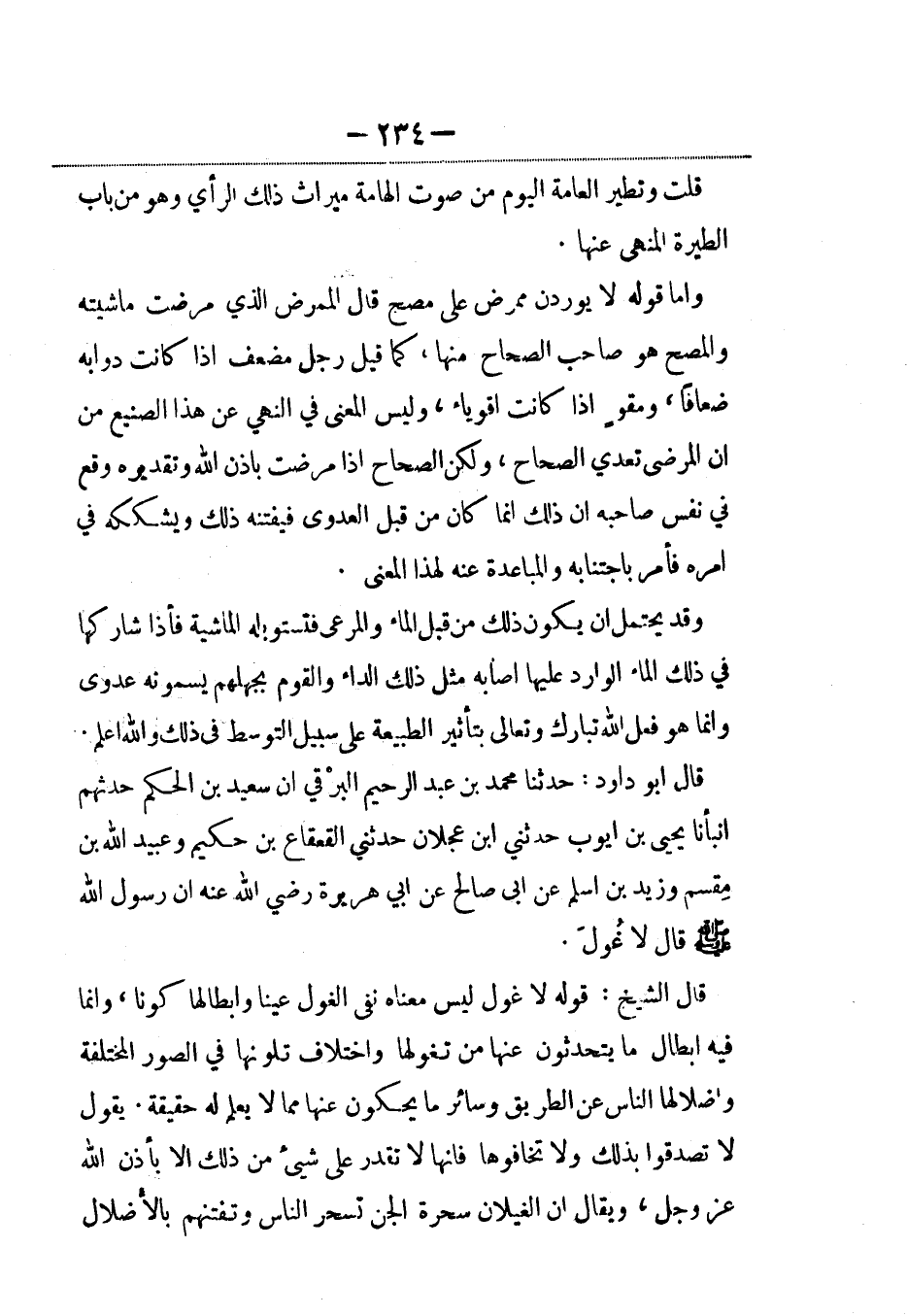 وقد يحتمل أن يكون ذلك من قبل الماء والمرعى فتستوبله الماشية فإذا شاركها في ذلك الماء الوارد عليها أصابه مثل ذلك الداء والقوم بجهلهم يسمونه عدوى وإنما هو فعل الله تبارك وتعالى بتأثير الطبيعة على سبيل التوسط في ذلك والله أعلم.