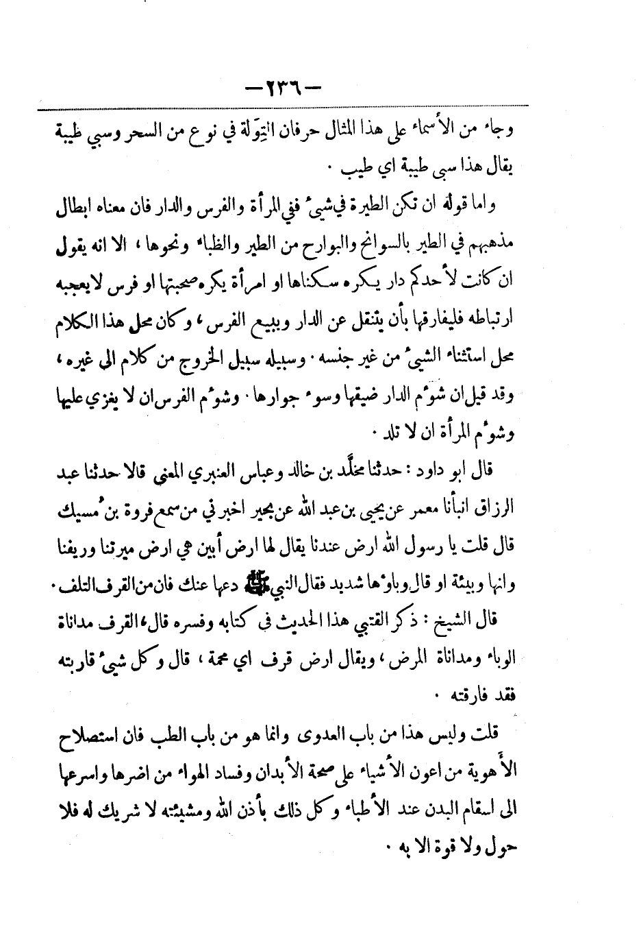 وأما قوله إن تكن الطيرة في شيء ففي المرأة والفرس والدار فإن معناه إبطال مذهبهم في الطير بالسوانح والبوارح من الطير والظباء ونحوها، إلاّ أنه يقول إن كانت لأحدكم دار يكره سكناها أو امرأة يكره صحبتها أو فرس لا يعجبه ارتباطه فليفارقها بأن يتنقل عن الدار ويبيع الفرس، وكان محل هذا الكلام محل استثناء الشيء من غير جنسه. وسبيله سبيل الخروج من كلام إلى غيره، وقد قيل إن شؤم الدار ضيقها وسوء جوارها وشؤم الفرس أن لا يغزى عليها وشؤم المرأة أن لا تلد.
