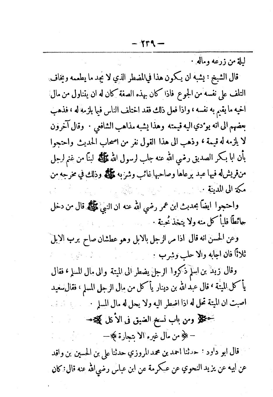 واحتجوا أيضاً بحديث ابن عمر رضي الله عنهما أن النبي صلى الله عليه وسلم قال: من دخل حائطاً فليأكل منه ولا يتخذ خُبنة.