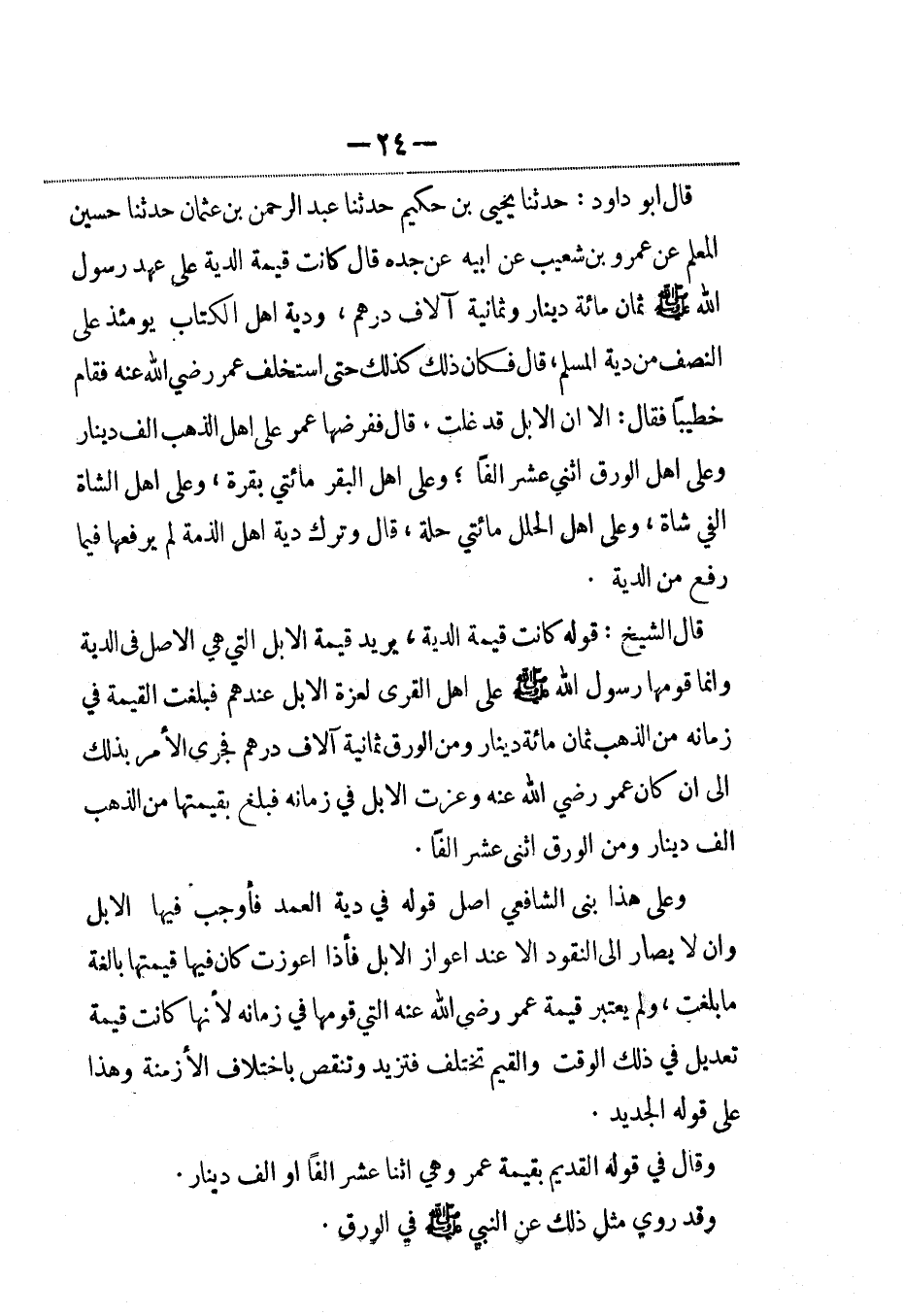قال أبو داود: حدثنا يحيى بن حكيم حدثنا عبد الرحمن بن عثمان حدثنا حسين المعلم عن عمرو بن شعيب عن أبيه عن جده قال كانت قيمة الدية على عهد رسول الله صلى الله عليه وسلم ثمانمائة دينار وثمانية آلاف درهم، ودية أهل الكتاب يومئذ على النصف من دية المسلم، قال فكان ذلك كذلك حتى استخلف عمر رضي الله عنه فقام خطيباً فقال: إلاّ ان الإبل قد غلت. قال ففرضها عمر على أهل الذهب ألف دينار وعلى أهل الورق اثني عشر ألفا؛ وعلى أهل البقر مائتي بقرة، وعلى أهل الشاة ألفي شاة، وعلى أهل الحلل مائتي حلة، قال وترك دية أهل الذمة لم يرفعها فيما رفع من الدية.