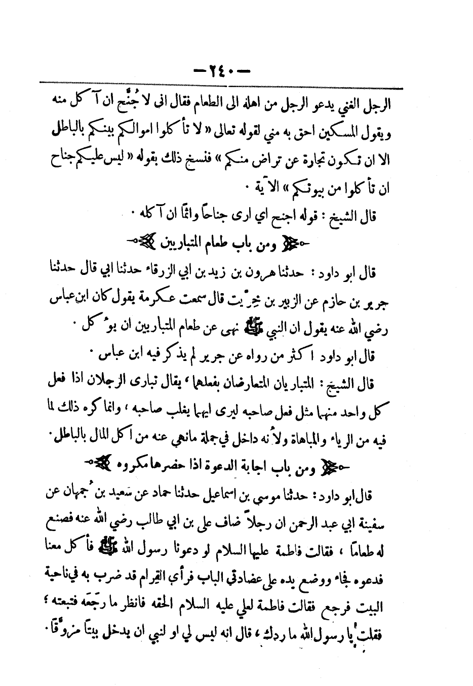 قال أبو داود: حدثنا هارون بن زيد بن أبي الزرقاء حدثنا أبي، قال: حَدَّثنا جرير بن حازم عن الزبير بن خُرّيت قال سمعت عكرمة يقول كان ابن عباس رضي الله عنهما يقول إن النبي صلى الله عليه وسلم نهى عن طعام المتباريين أن يؤكل.
