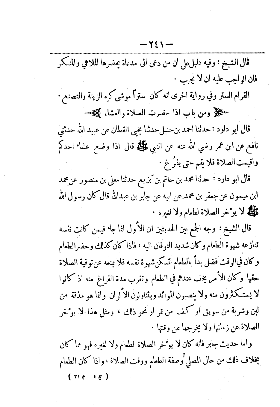 قال أبو داود: حدثنا محمد بن حاتم بن زريع حدثنا معلى بن منصور عن محمد بن ميمون عن جعفر بن محمد عن أبيه عن جابر بن عبد الله قال كان رسول الله صلى الله عليه وسلم لا يؤخر الصلاة لطعام ولا لغيره.