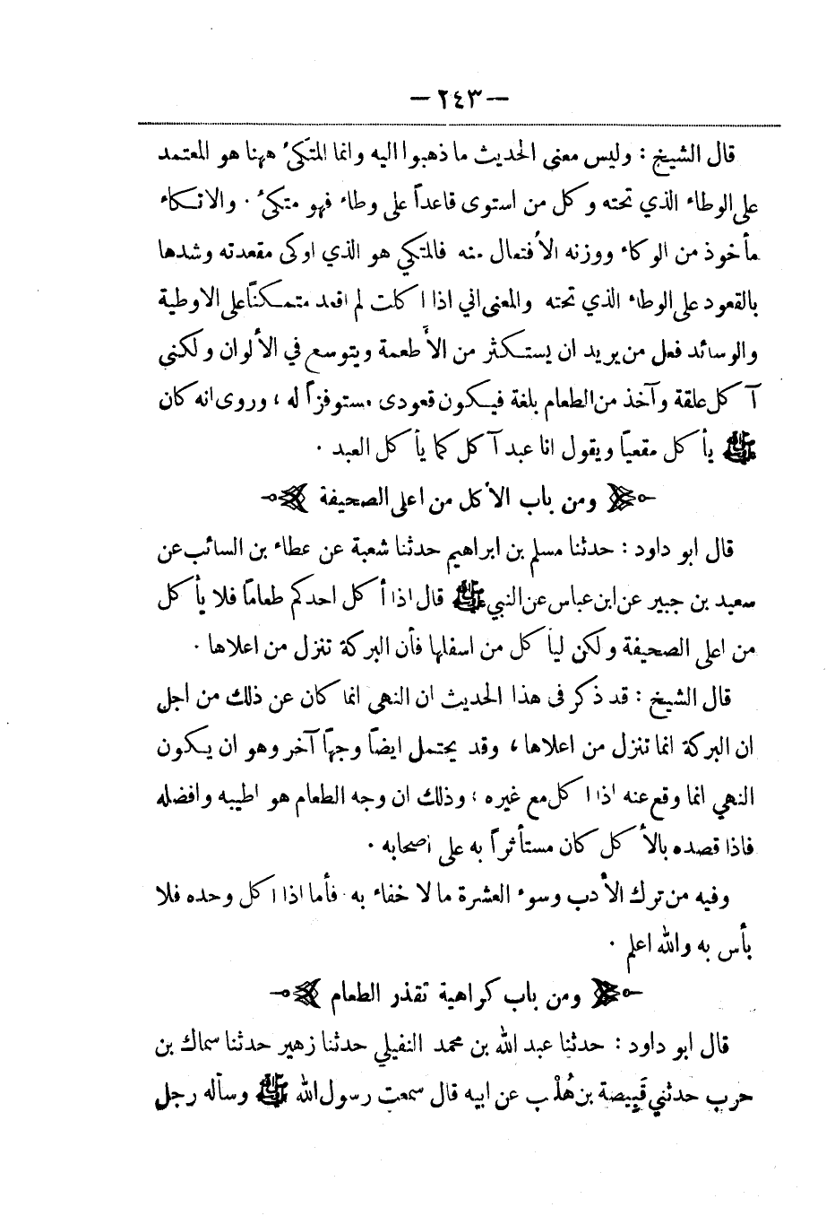 قال أبو داود: حدثنا مسلم بن إبراهيم حدثنا شعبة عن عطاء بن السائب عن سعيد بن جبير عن ابن عباس عن النبي صلى الله عليه وسلم قال: إذا أكل أحدكم طعاماً فلا يأكل من أعلى الصحيفة ولكن ليأكل من أسفلها فإن البركة تنزل من أعلاها.