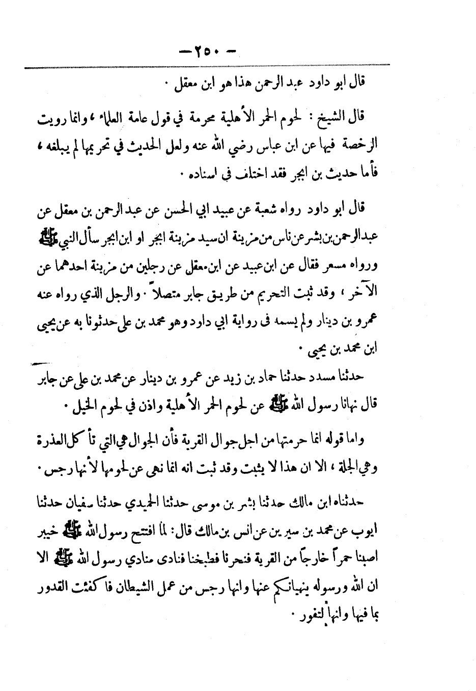 حدثناه ابن مالك حدثنا بشر بن موسى حدثنا الحميدي حدثنا سفيان حدثنا أيوب عن محمد بن سيرين عن أنس بن مالك قال: لما افتتح رسول الله صلى الله عليه وسلم خيبر أصبنا حمراً خارجاً من القرية فنحرنا فطبخنا فنادى منادي رسول الله صلى الله عليه وسلم إلاّ ان الله ورسوله ينهيانكم عنها وأنها رجس من عمل الشيطان فأكفئت القدور بما فيها وإنها لتفور.