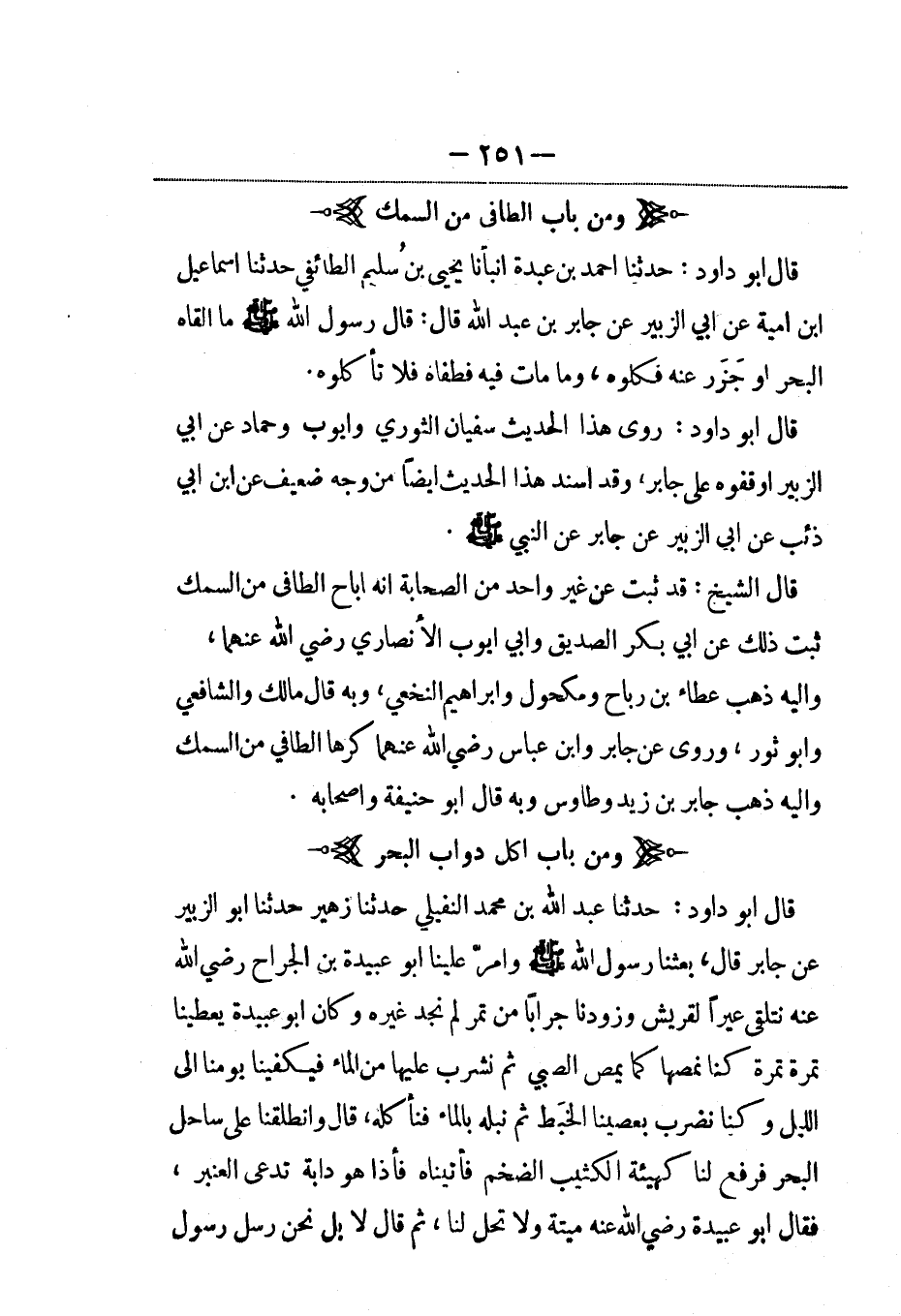 قال أبو داود: حدثنا أحمد بن عبدة أنبأنا يحيى بن سُليم الطائفي حدثنا إسماعيل بن أمية، عَن أبي الزبير عن جابر بن عبد الله قال: قال رسول الله صلى الله عليه وسلم ما ألقاه البحر أو جَزَر عنه فكلوه، وما مات فيه فطفاه فلا تأكلوه.