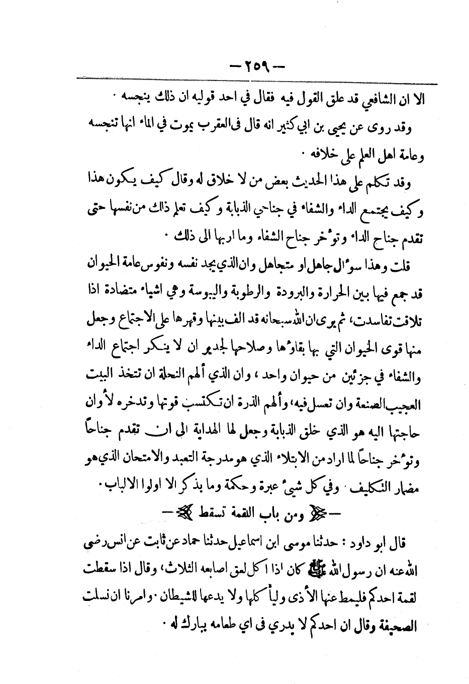 قلت: وهذا سؤال جاهل أو متجاهل وإن الذي يجد نفسه ونفوس عامة الحيوان قد جمع فيها بين الحرارة والبرودة والرطوبة واليبوسة وهي أشياء متضادة إذا تلاقت تفاسدت، ثم يرى أن الله سبحانه قد ألف بينها وقهرها على الاجتماع وجعل منها قوى الحيوان التي بها بقاؤها وصلاحها لجدير أن لا ينكر اجتماع الداء والشفاء في خزأين من حيوان واحد، وأن الذي ألهم النحلة أن تتخذ البيت العجيب الصنعة وأن تعسل فيه، وألهم الذرة أن تكتسب قوتها وتدخره لأوان حاجتها إليه هو الذي خلق الذبابة وجعل لها الهداية إلى أن تقدم جناحاً وتؤخر جناحاً لما أراد من الابتلاء الذي هو مدرجة التعبد والامتحان الذي هو مضمار التكليف وفي كل شيء عبرة وحكمة وما يذكر إلاّ أولو الألباب.