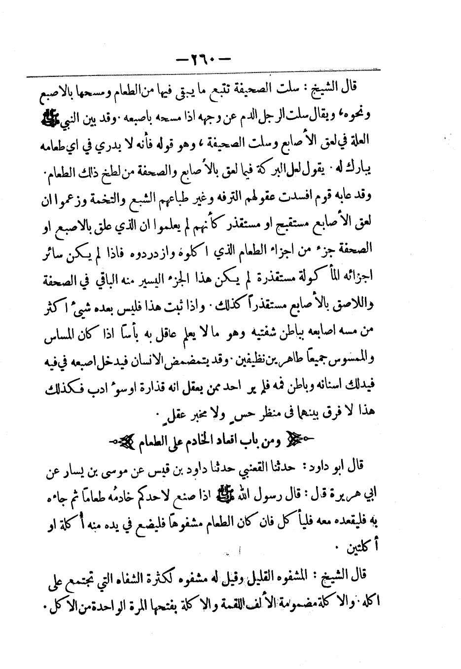 قال أبو داود: حدثنا القعنبي حدثنا داود بن قيس عن موسى بن يسار، عَن أبي هريرة قال: قال رسول الله صلى الله عليه وسلم إذا صنع لأحدكم خادمُه طعاماً ثم جاءه به فليقعده معه فليأكل فإن كان الطعام مشفوهاً فليضع في يده منه أُكلة أو أكلتين.