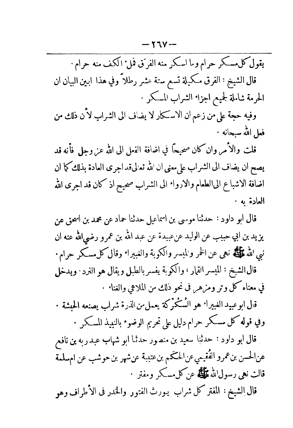 قال أبو داود: حدثنا موسى بن إسماعيل حدثنا حماد عن محمد بن إسحاق عن يزيد بن أبي حبيب عن الوليد عن عبيدة عن عبد الله بن عمرو رضي الله عنه أن نبي الله صلى الله عليه وسلم نهى عن الخمر والميسر والكوبة والغبيراء وقال كل مسكر حرام.